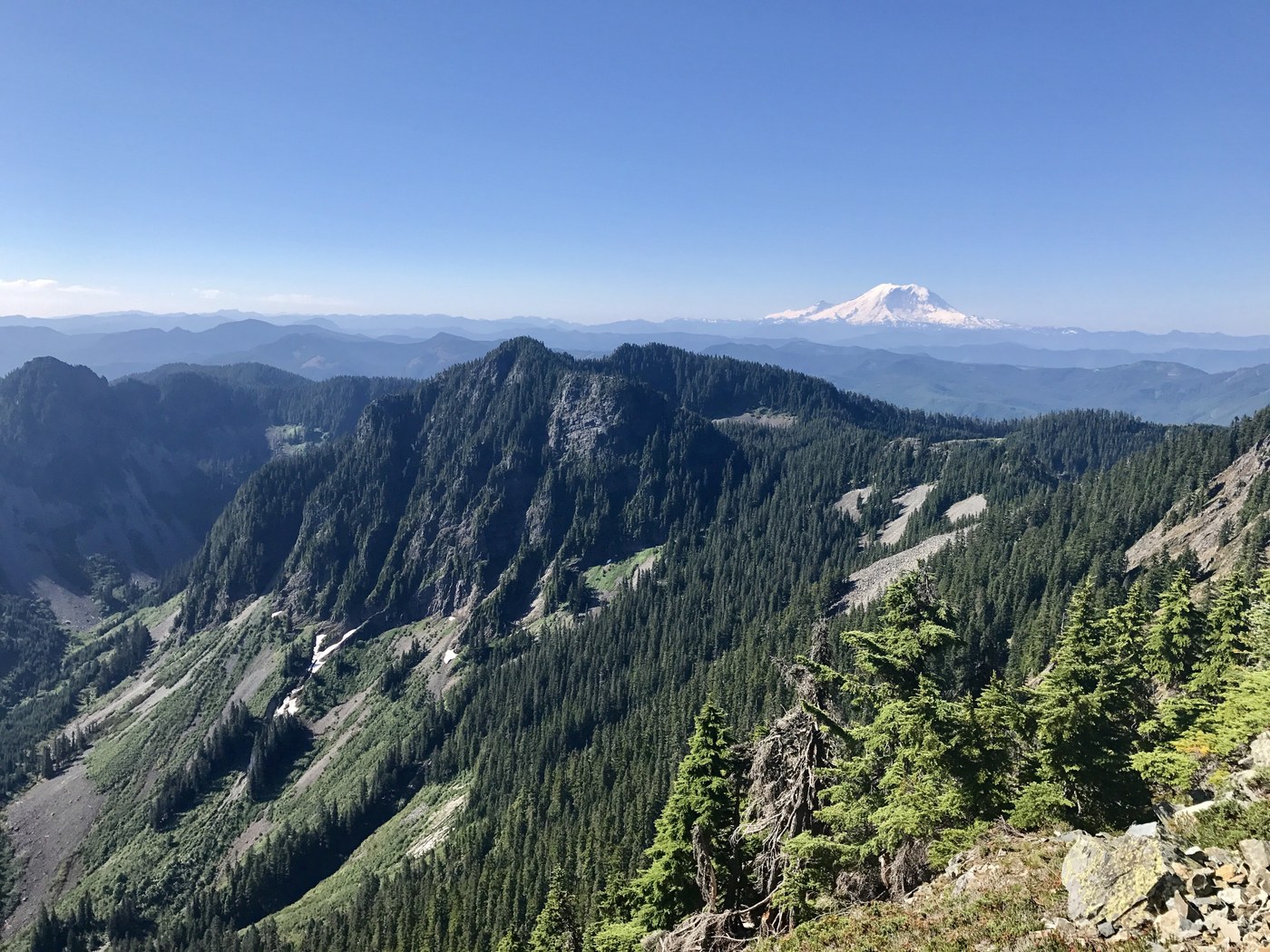 There were two groups of two on the summit when I arrived, but it is a large area with plenty of space. I lounged around on the summit for a while until I had it to myself. The drop off to the Northwest of the summit is quite impressive. I had views of the Olympics, Seattle, Mount Baker in the distance, all over the Central Cascades, and spectacular views of the North side of Rainier.