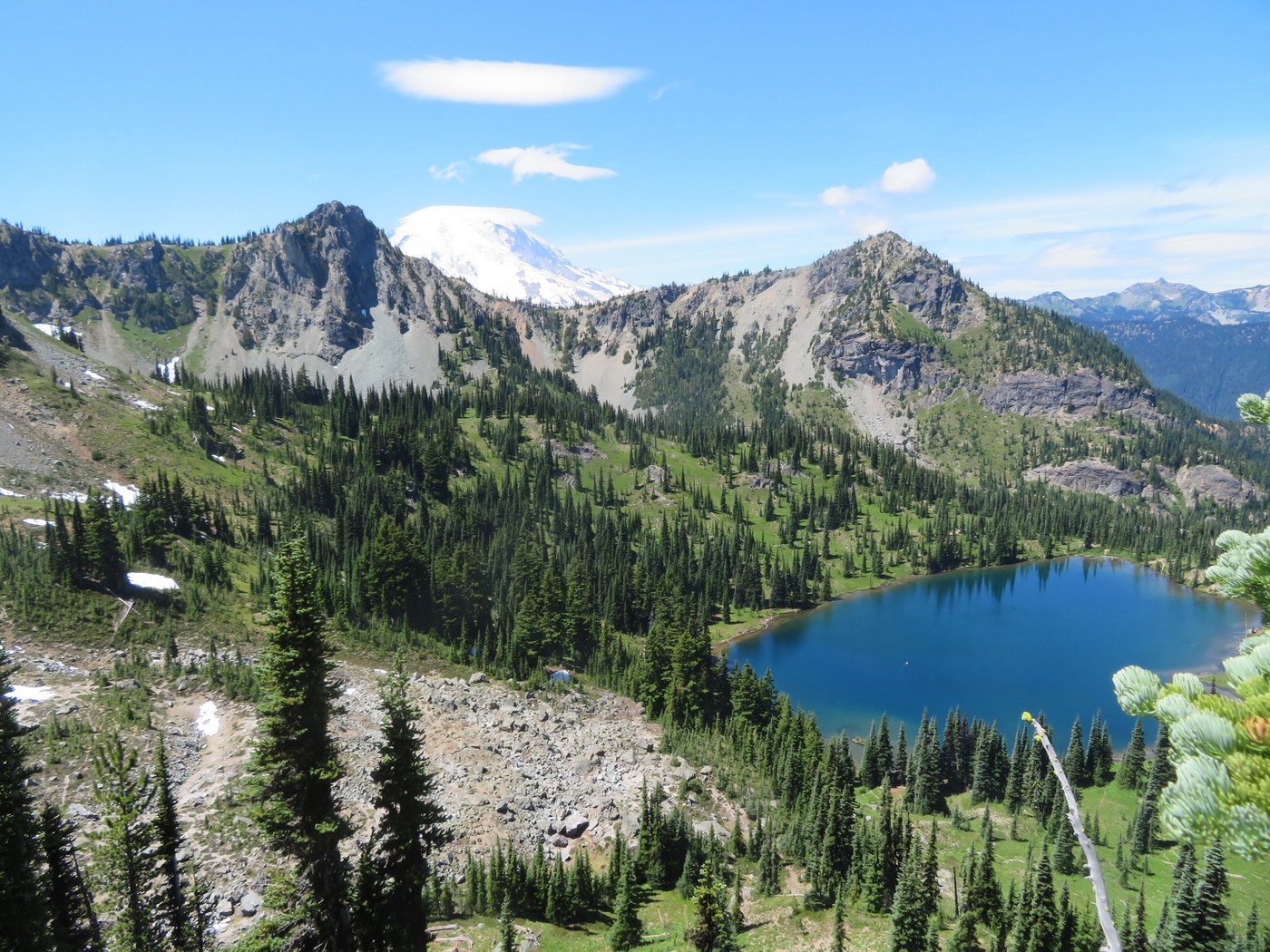 To extend this hike, follow the Pacific Crest Trail north for another half mile, then turn left on a side trail where you will soon be treated to views of Chrystal Lake and Mt. Rainier.