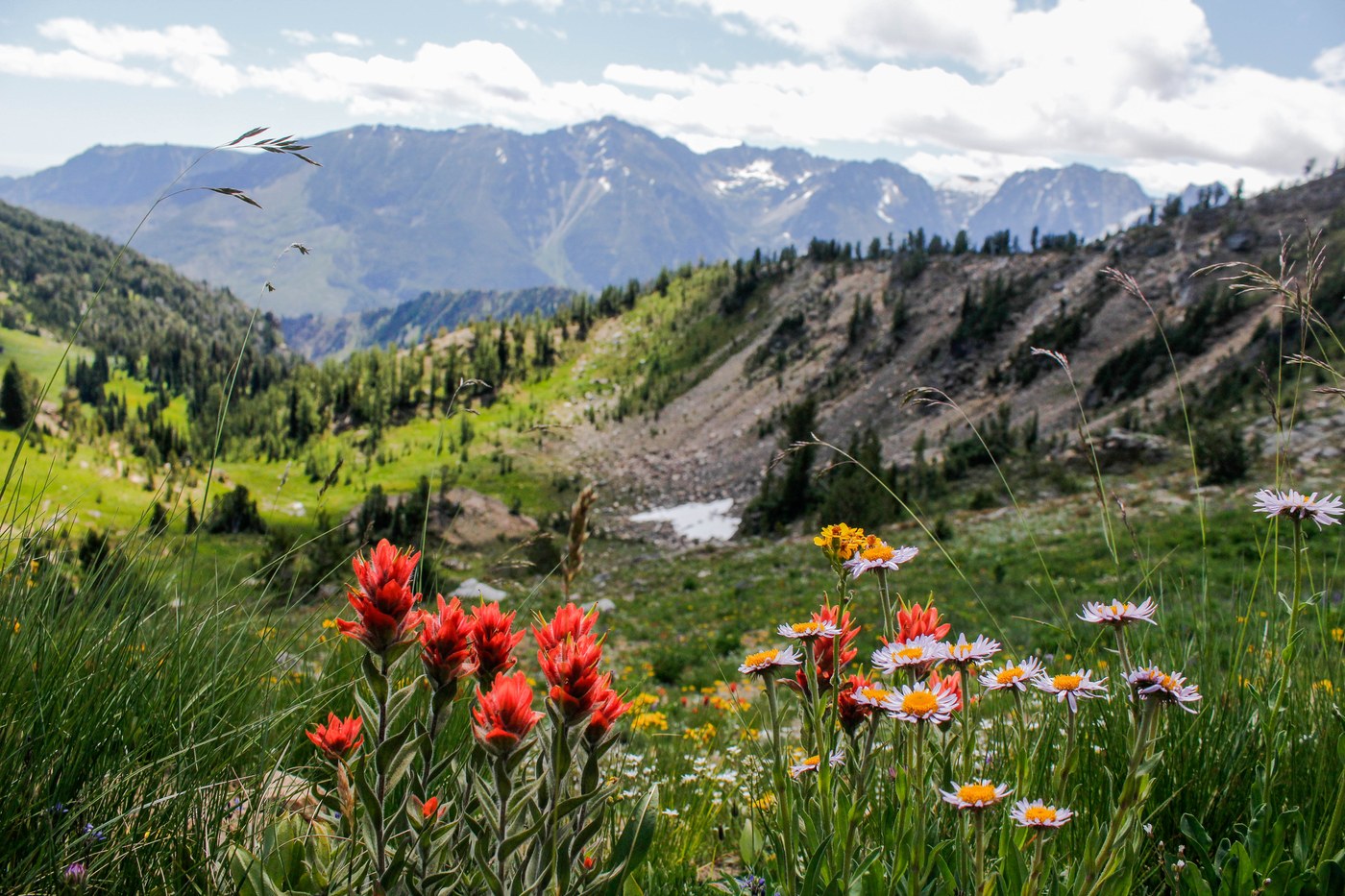 In the morning we awoke to mosquitoes completely covering the mesh of my tent and they swarmed us the moment we exited our see-through sanctuary. They continued to harass us the entire time until we departed for our day trip to Windy Pass. We left camp around 10am and passed Little Caroline Lake, which is more comparable to a swamp. We also passed a small stream that was ice cold from a snow patch above and we opted to refill our waters there. The wildflowers in the meadows up to the pass were pretty stunning and we stopped several times to get our photos. We ran into two rangers near the top and they answered all of our questions and inquiries.