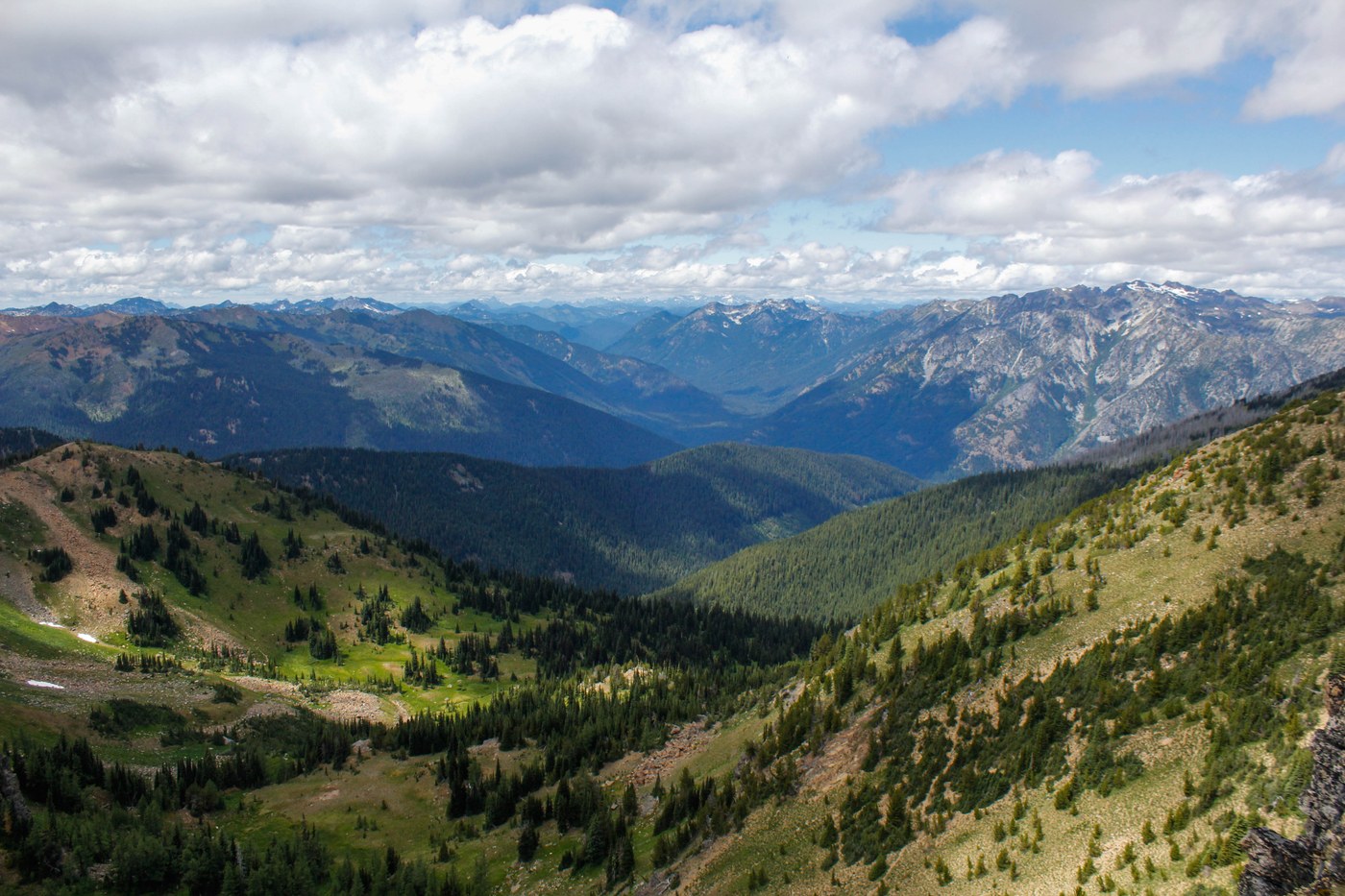 The views at the pass were pretty awesome. At the pass we took a right and went as far as we dared up the ridge before turning back, at one point getting high enough to catch a glimpse of Mt. Rainier. We got back to Windy Pass and decided to go up to the left since we still had plenty of time and we had a pretty good view of Cashmere Mountain. On the way back down we were all loathing the idea of spending another night waiting out the bug horde and we came to a consensus that we would just head back to the trailhead instead.