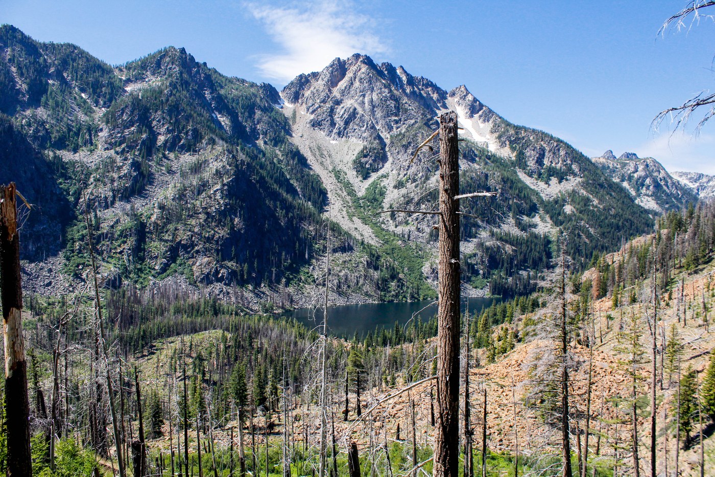A friend of mine won the lottery for the Eightmile/Caroline Zone and invited me. We had a group of 7 people with all levels of backpacking experience. We left the Eightmile trailhead at about 8:30 Friday morning in good spirits, but for most of us this was the first backpacking trip this season so we were getting tired out pretty quickly. We decided against going to Eightmile Lake and instead going straight to Lake Caroline. It was a hot and exposed hike as mentioned on the WTA description and trip reports, but the magnificent views more than made up for it. There are lots of wildflowers and a couple of creeks on the way, so you can refill water or take pictures as needed.