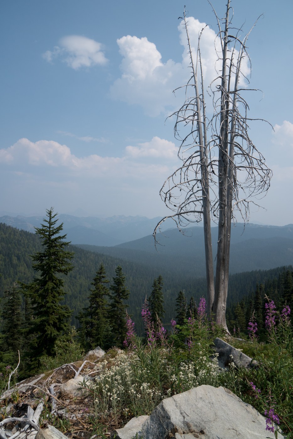 Paid a visit to pretty Escondido Tarns. Of note, there are signs requesting people to camp elsewhere than the tarns. There are plenty of great campsites along the PCT with even better views than from the tarns themselves. Made camp on the ridge with great views across to Overcoat and Chimney Rock. Bugs weren't bad until the afternoon heat diminished and then were a bit annoying. Hiked out along a nice waytrail until I got a view down to Summit Chief Lake. Pretty little lake. Skipped the descent to the lake and returned to camp to lounge around and enjoy the views. Smoke cleared up right around sunset for a really nice show!
