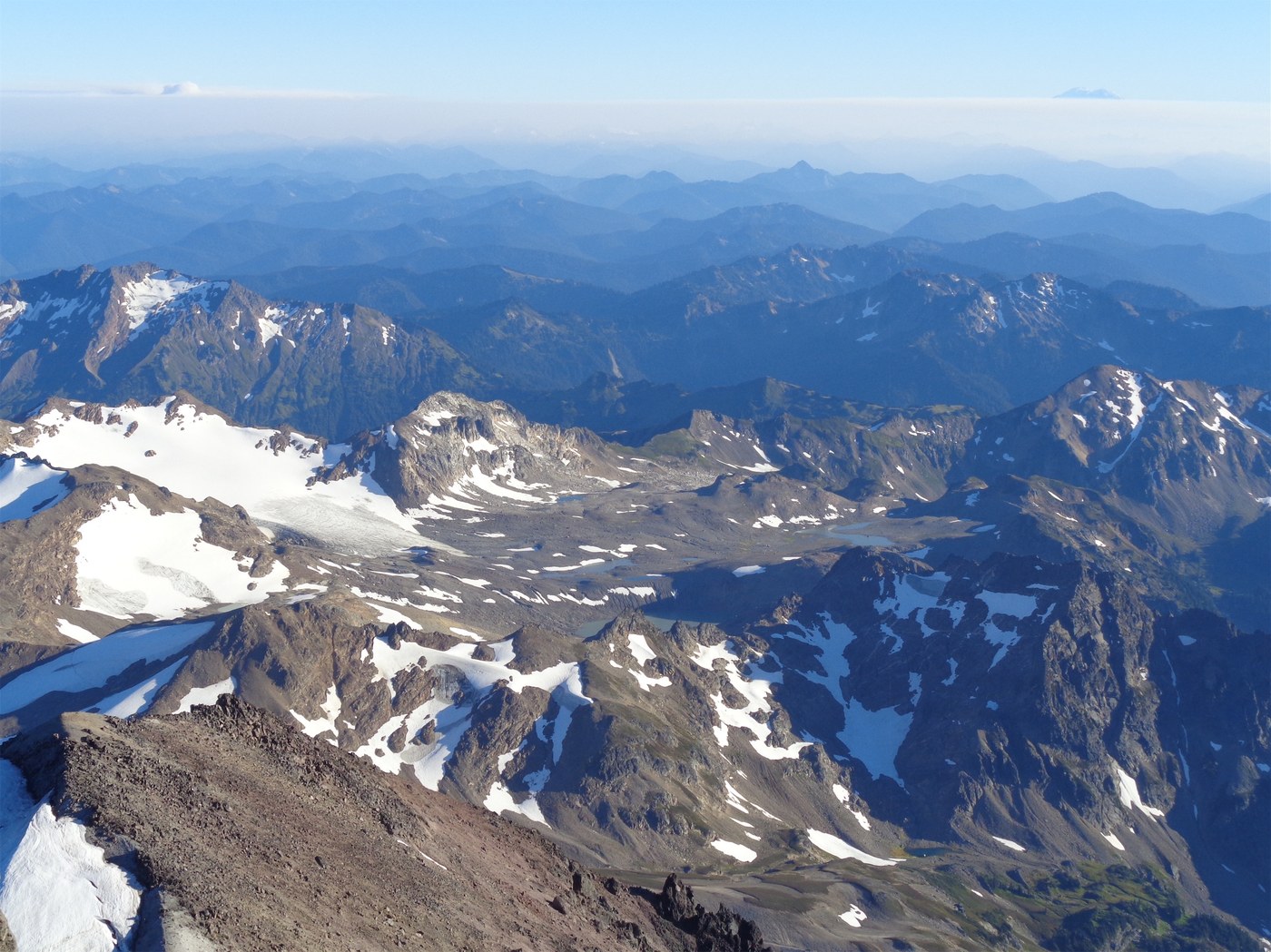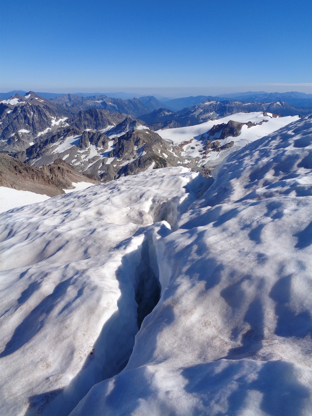 Glacier Gap is where we camped. No running water, so stock up on the way down from the peak unless you want to have to walk to a snow patch and melt snow (I'm lazy, so I did not). From Glacier Gap you cross one more saddle where you drop to the ridge and follow that to the Gerdine Glacier, which is still in good shape besides the nasty rock fall coming off Disappointment Peak (think microwave to car sized boulders, yuck).
