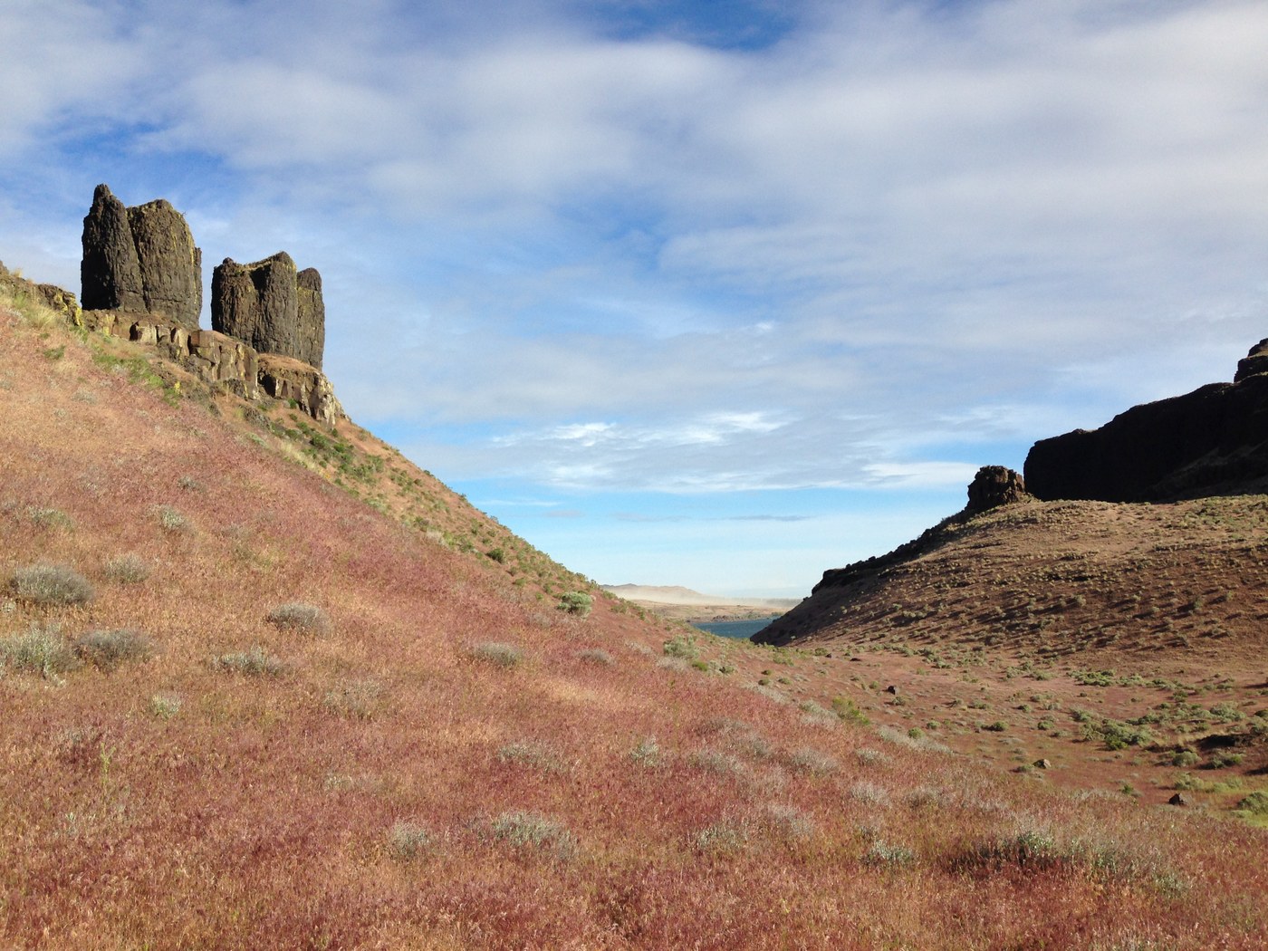 The trailhead was a bit hard to find; we drove past it once since the parking area/ trailhead is inset from a curve in the road when coming from the wallulla gap junction. There was a ladder to get up and over the barbed wire. The trail itself was obvious. We got lovely views from the base of the twin sisters rocks.