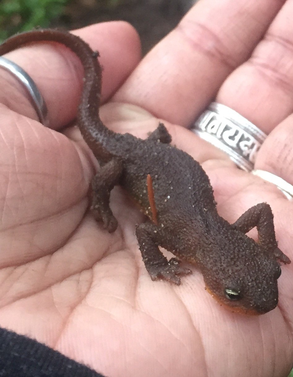FYI I believe that is a rough-skinned newt. They excrete a toxin that is harmful to humans. Some people get skin irritation after holding them. Just want to make sure you knew! I would wash hands thoroughly afterwards, if you are going to pick them up.