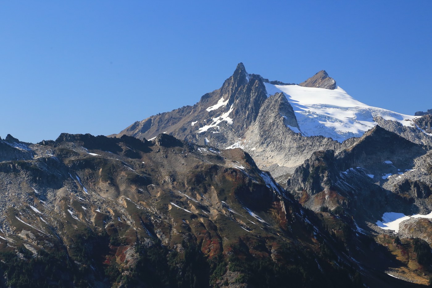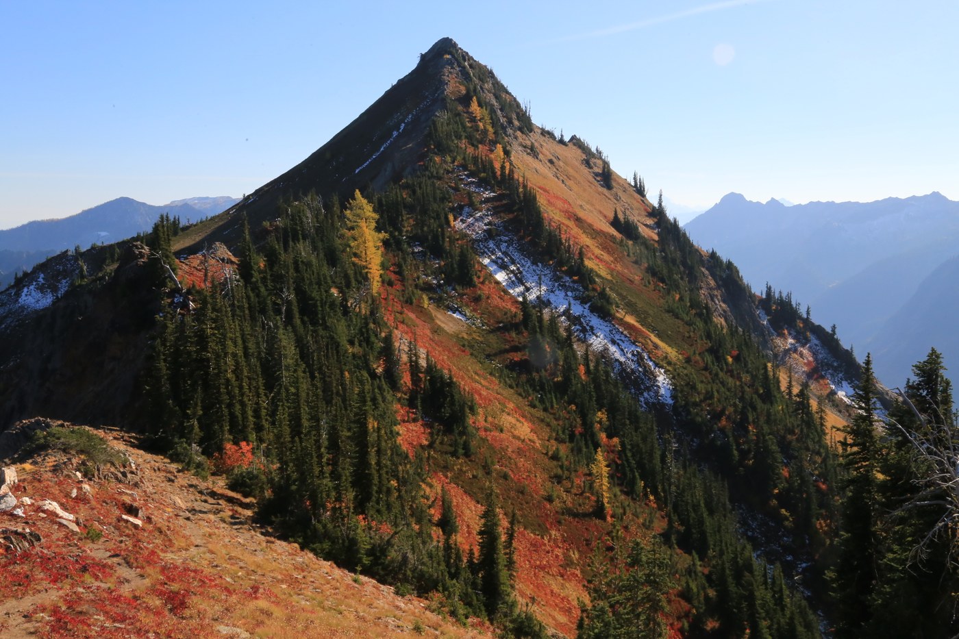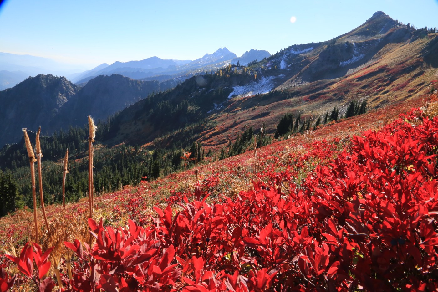 The upper meadows are ablaze in color. The leaves of the blueberry bushes have painted entire hillsides the color of rust, and a smattering of the larches are fully golden in some places. It makes for a stunning contrast. Most of the Napeequa River valley is still green, but swaths of orange and red are visible on the lower reaches of the slope nearer to Little Giant Pass. In the distance, you can see other groves of larches starting to turn. Not quite golden yet, but well on their way.