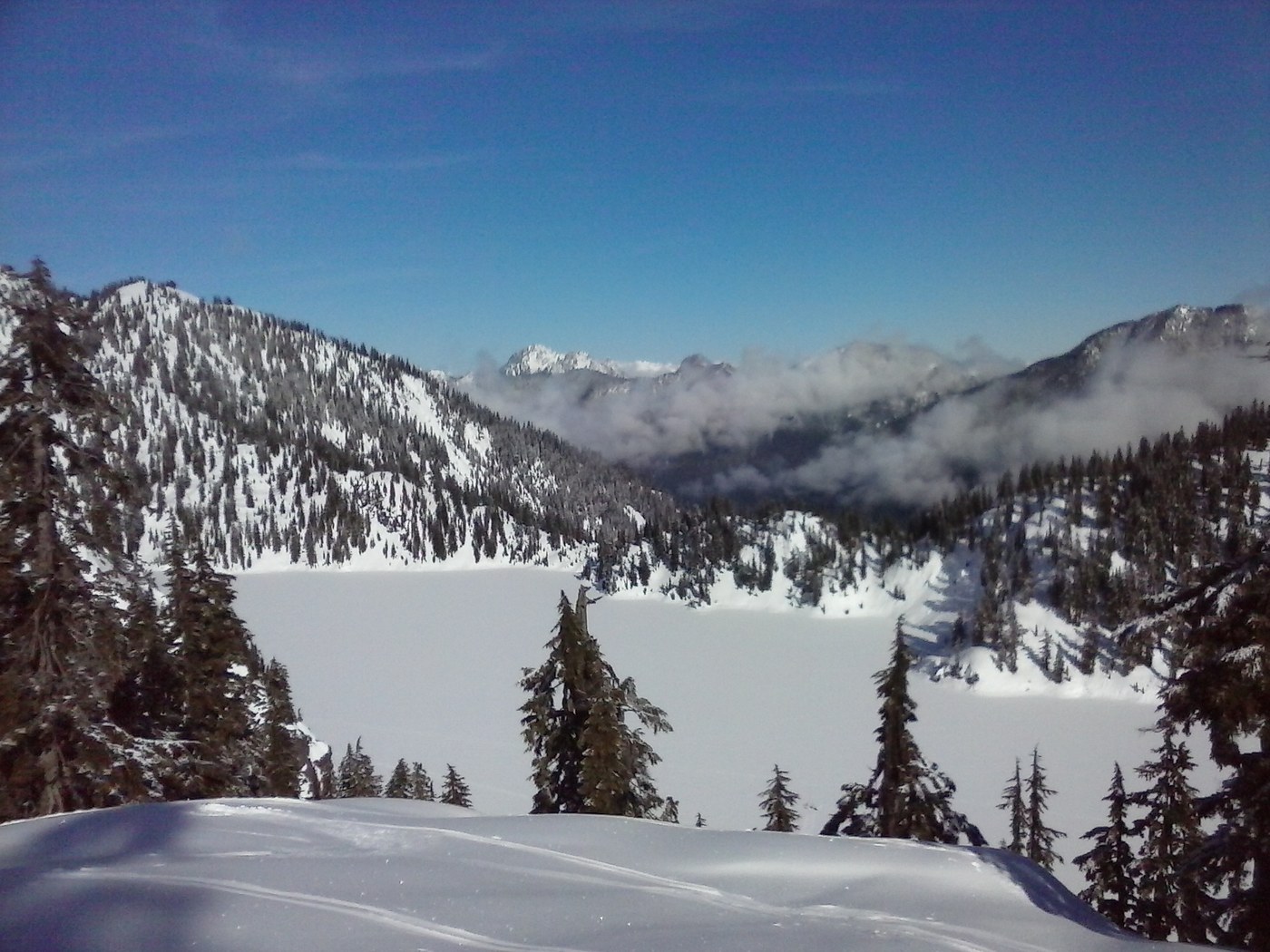 Made it to source lake, continued straight uphill from there and curved right towards the alternate summer trail to snow lake and overlook. Got a great view of the lake. The return down the slope towards Source Lake was a bit tricky and required comfort on traversing steep, open slopes.