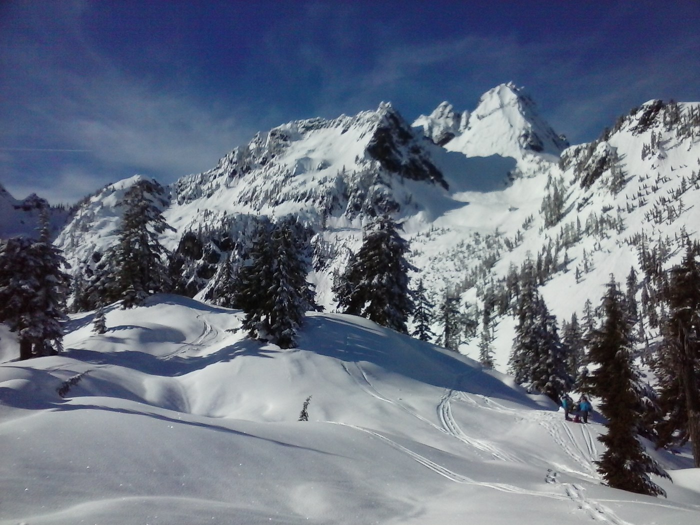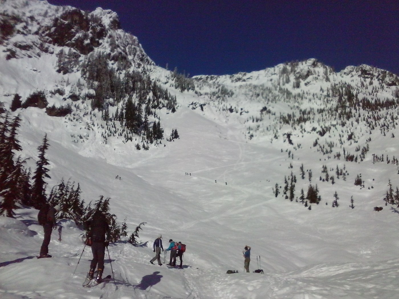 The winter route is far safer avalanche wise, along the southwest side of the creek on the other side of the valley as the summer trail. Trail was wide for a mile or so and then becomes more of a traditional trail width. Was clear to follow the entire way.