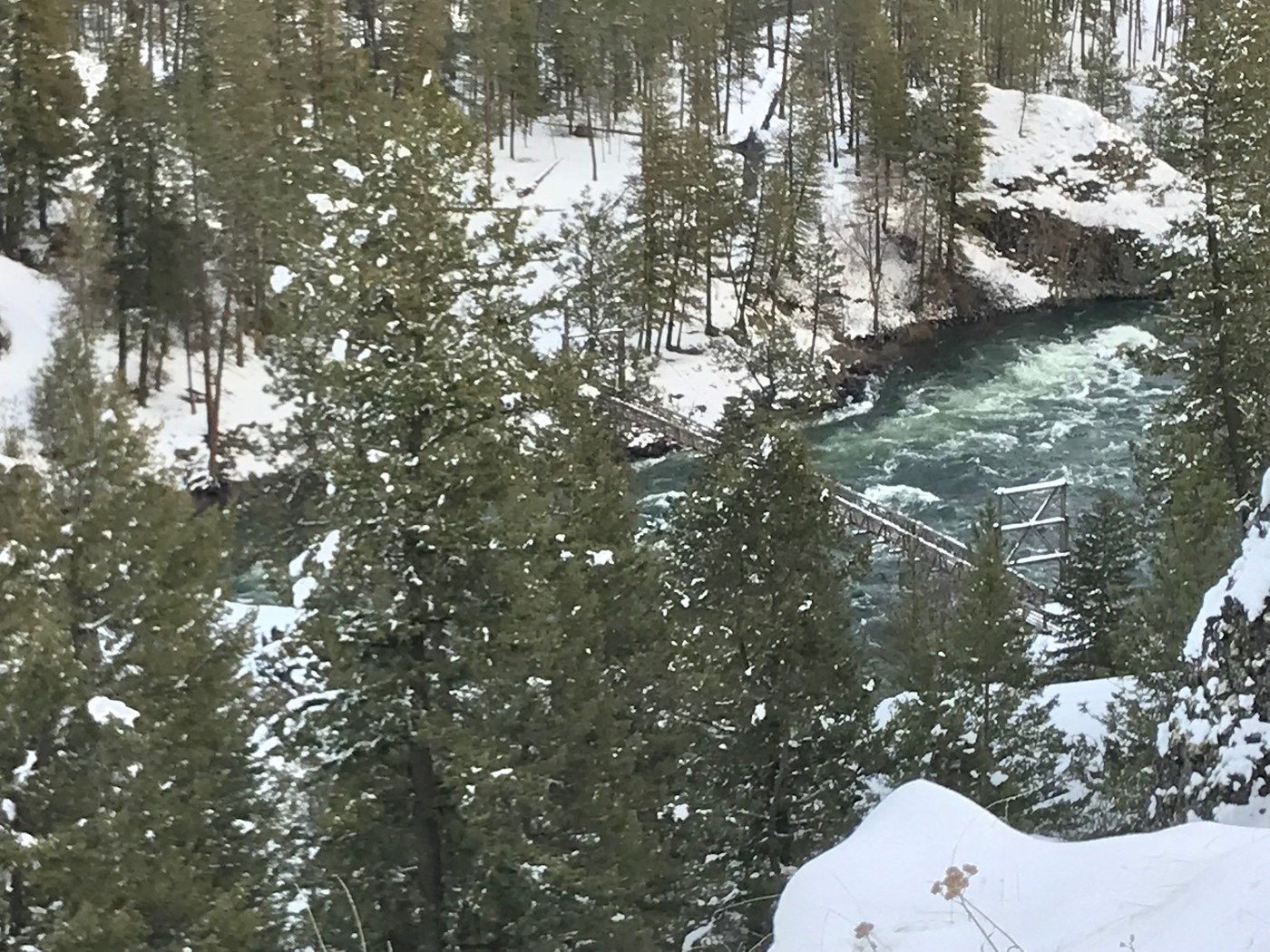 The path to the bridge from the lower parking lot and and the bridge were snow free. After crossing the bridge, the snow was well packed at first. I headed right, or upstream on trail 25. At first, the trail was well traveled, but not packed. Shorty after the second overlook, I was plowing snow with my boots. The sky was blue, the sun was warm. I slogged on, following the trail until it met the road which is also the Centennial Trail. I turned right, or uphill, on the road which was well plowed to the top of the hill. After I started downhill, the trail was snow covered again, but with lots of tracks to follow, so I was not plowing as much.