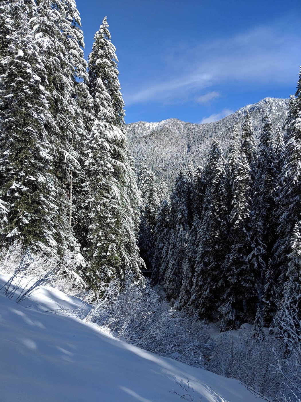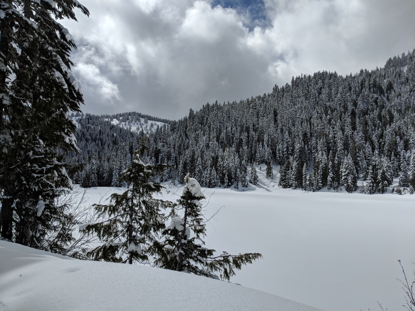 Up to Deer Lake: There's a small blow-down by the junction to Deer Lake, but it's easily navigated. You won't need snowshoes until maybe half a mile up, but then you'll really need them. There's several feet of powder at times, interspersed with small creeks caused by melt-off. We had to do some step-kicking at times to cross three-foot deep rivulets, which caused us to ascend a bit more slowly than I anticipated. The only truly dicey portion of the trip is the final approach to the lake, where there's a steep drop off to the left.