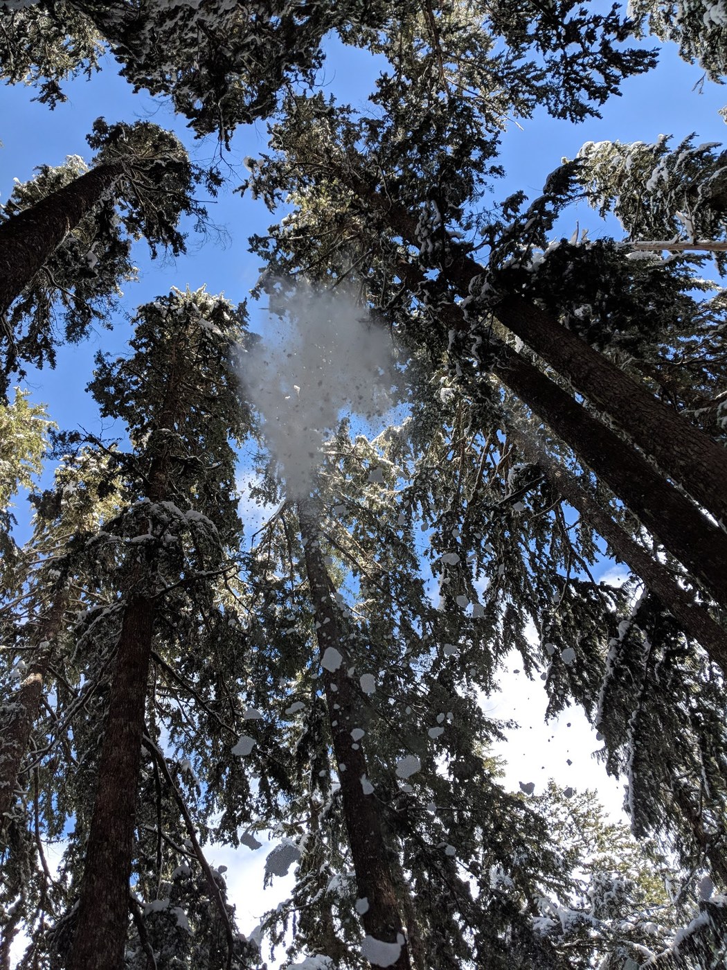 Heading Down: The lake itself is placid and a bit unremarkable, almost entirely frozen over. We made good time on the way down, and around halfway ran into an ill-prepared hiking party in jeans that did not have snowshoes. They had been postholing up the whole way, and looked less than thrilled. Also, the amount of snow melting and falling from the tree canopy was visually stunning, and physically too: I got a few hard knocks on the head from plummeting clods of ice.