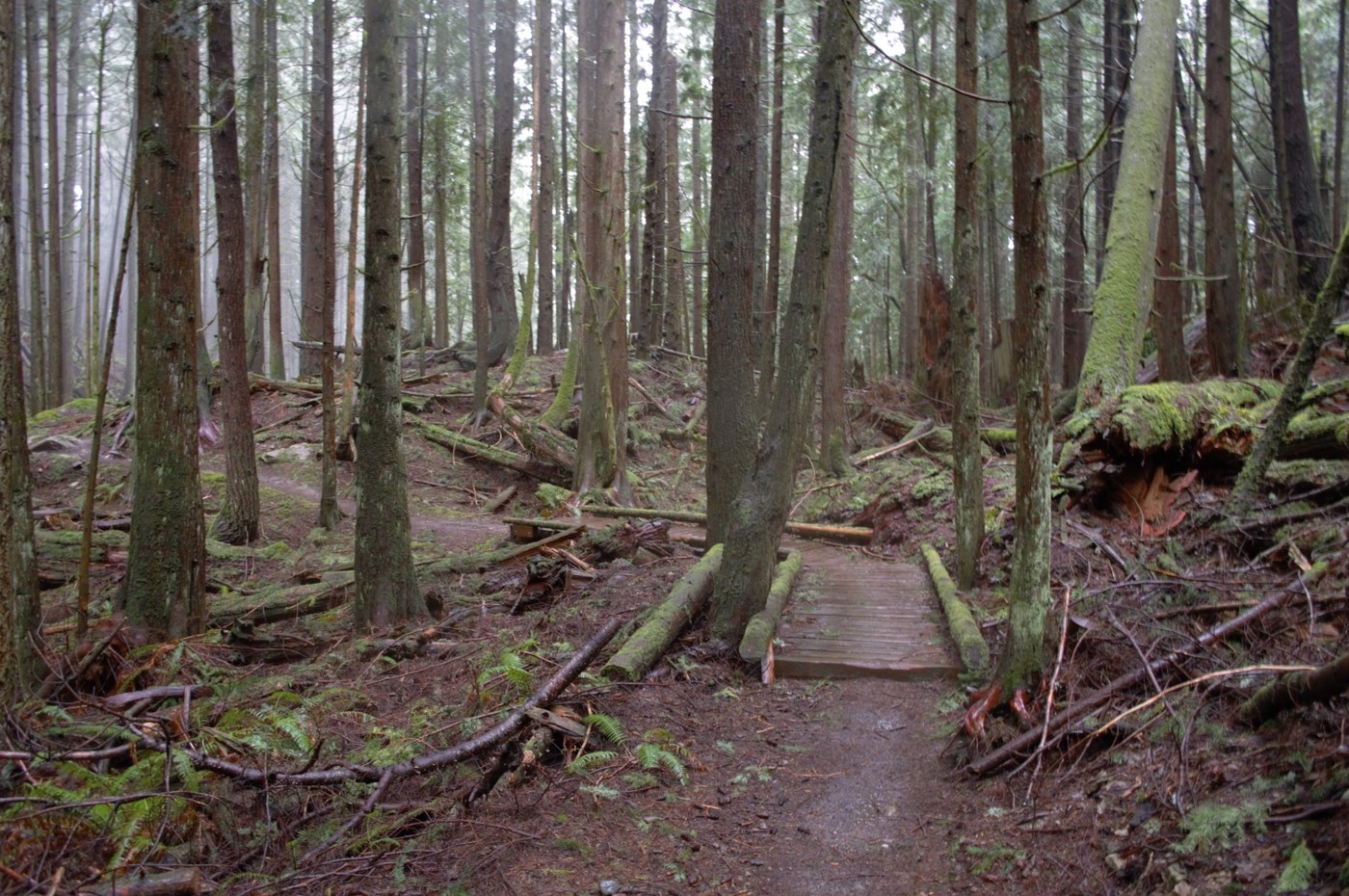 Started out this afternoon from Arroyo Park, made Chuckanut Falls my first destination then I connected back to the Hemlock Trail. Continued on for about a half mile then started up the Huckleberry Trail and completed Huckleberry Trail for about 1.8 miles until I reached the Raptor Ridge Trail. Turned left up towards the Raptor Ridge Overlook. It was a very wet day. The trail had numerous puddles and mud from the overlook and the clouds where blowing thinly through the trees with the rain coming down. Without any letting up, I continued down the Raptor Ridge Trail to connect to the Hemlock Trail. Took this all the way back to Arroyo for about 3 miles with a little double backing after I had gotten turned around and started off for Lost lake at the intersect but felt that I had gone the wrong way before I made it too far down the trail. The Huckleberry Trail is a neat trail to check out with the trail navigating near old logging roads and through second growth trees that seem to be doing very well, lots of evidence of many trees that didn't make it through last season but trail crews have done a awesome job of keeping the trails cleared and free of debris. I also liked the Raptor Ridge Trail descent down to the Hemlock with little mellow switch backs along the rugged terrain, great views of trees growing along rock faces here.