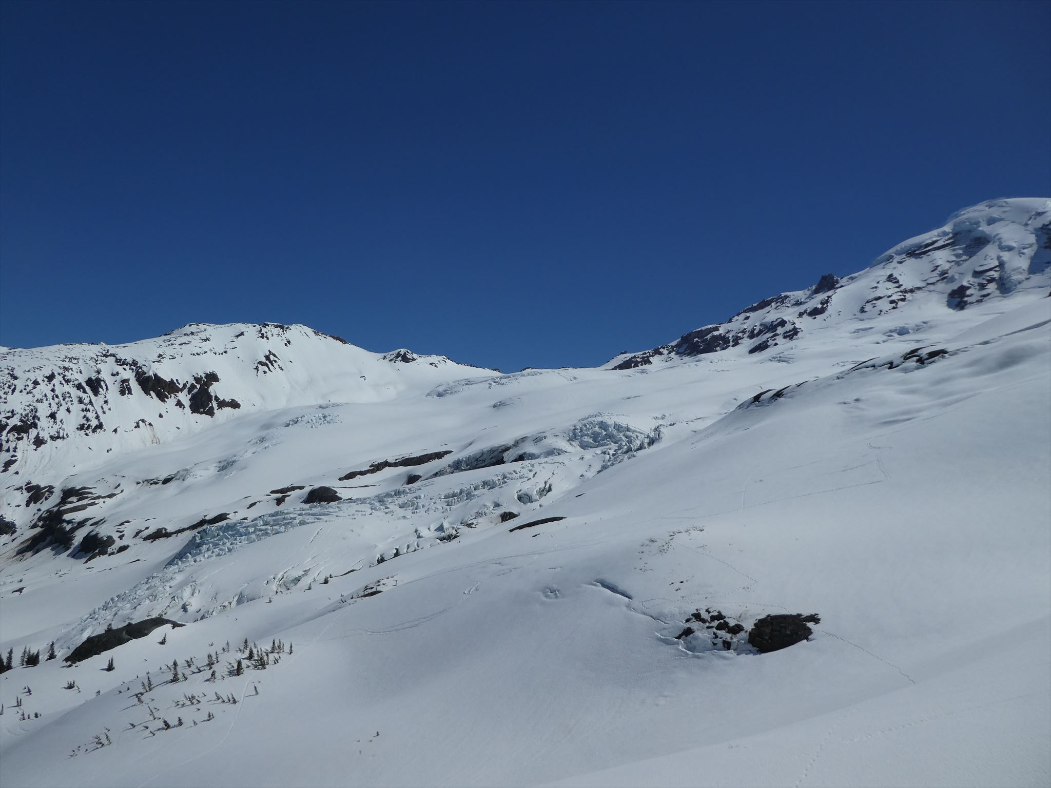 I knew Glacier Creek Rd was open to mile 7 (which is normal for this time of year) so it was time for my early May hike up to Hogsback base camp. Parked and was on snow immediately. There is intermittent road showing through but I would say it is 2/3 covered the remaining mile up to the trail entrance. About 7/8 of the trail is under snow but it compact, the normal snow bridges are intact. Once above treeline (above Kulshan Cabin site) I went straight up the Hogsback. I knew to come early so the snow was still firm and I was able to walk up in the steps kicked in by the three (or more) guys in front of me. I carried my snowshoes but ended up just needing my microspikes on the way up. After sitting up top an hour or so enjoying the views I headed back down in the slushy snow, here is where I was glad I brought the flotation devices. Beautiful day on the mountain, couldn't have asked for better.