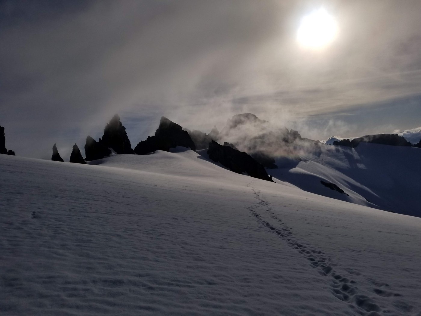 Camp out, nap, or head up. It's about an hour to an hour and a half to summit from accessing east ridge. Stay far left (south) on east ridge to avoid opening cracks and crevasses. Boot path SHOULD be evident and well from harm.