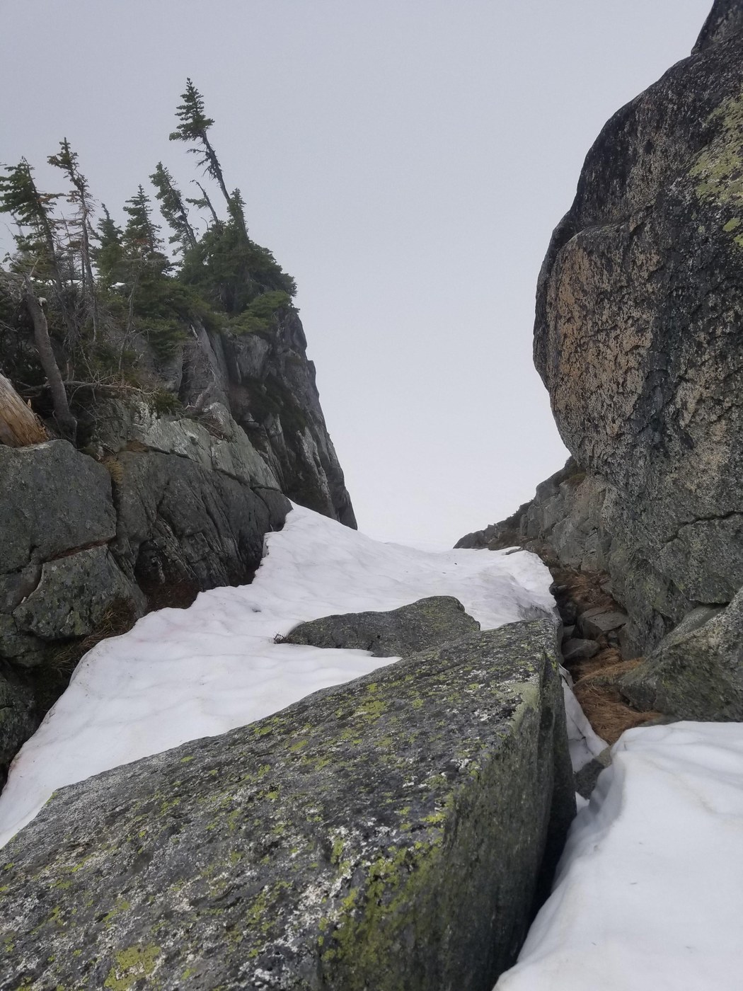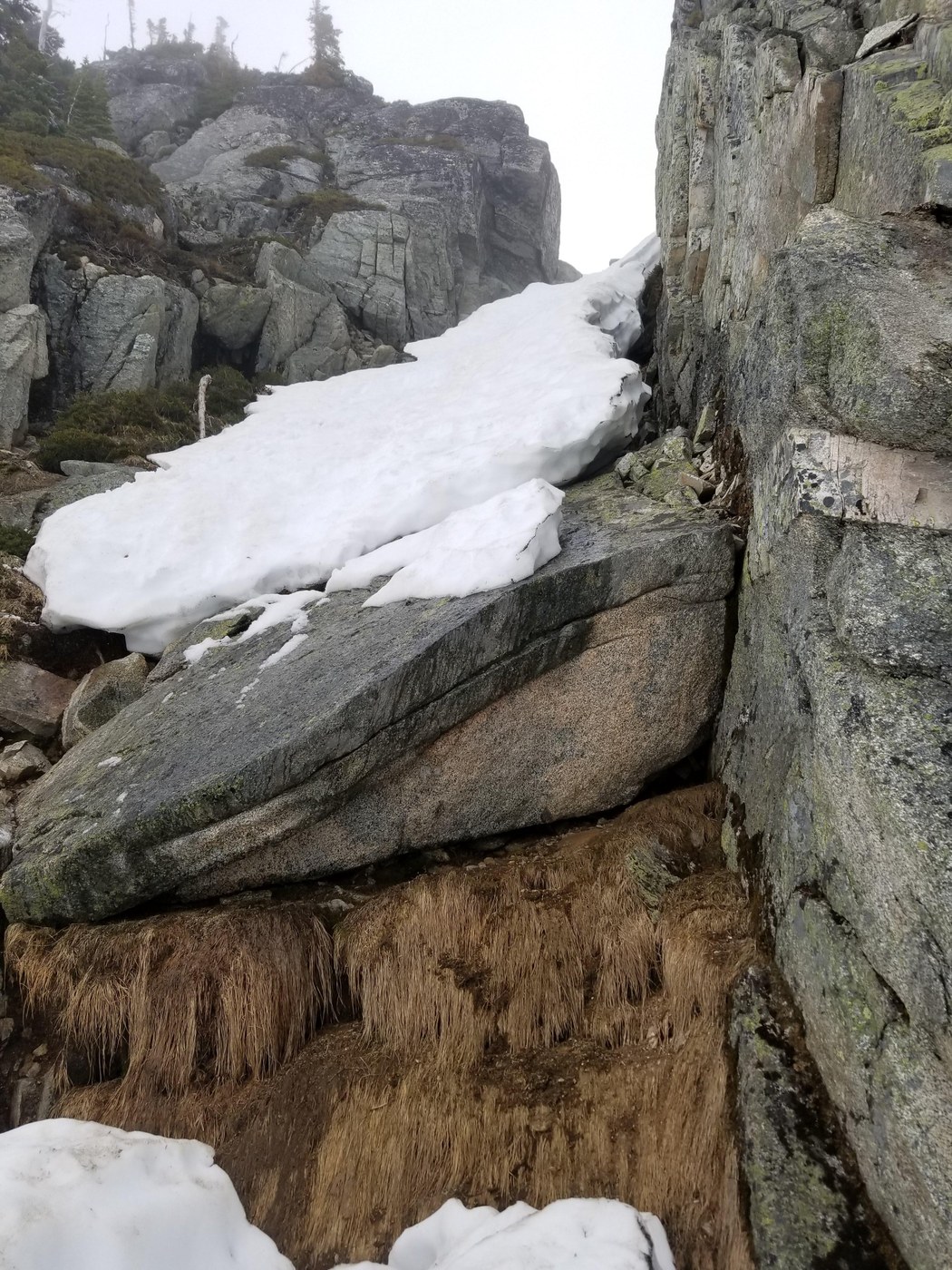 There are a few options here. Both involves a bit of scramble/climbing at the bottom. The snow has melted a 20-30ft section at the bottom of the typical notch, but there is less snow gap slightly further south (look for former camping spot/trench on ridge). Be very careful a slip wherever downclimbing could be nasty.