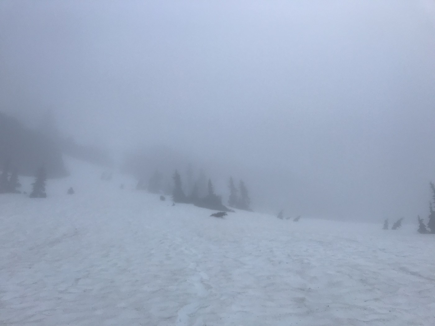 Spent the night at the trailhead in order to get an early start for good snow. Woke up at 4 and found area totally socked in. Waited until 5 and the fog had let up a bit. Started at 5:25 up the primitive trail. It’s pretty clear to follow but definitely not your normal day hike. We had a GPS which helped us since we got off trail a bit. Planning to do a Washington - Ellinor traverse but wanted to summit Washington first. Headed right once we got to the jct with the traverse. Route got pretty sketchy once we reached a section with snow and rock. My partner decided to stay at the base of the steep snow while I continued. Do not attempt this if you are not comfortable rock climbing and scrambling. Headed right again towards the summit, which was mostly obstructed with clouds. Route is pretty clear but the summit does require some dicey scrambling. Maybe I took the wrong way, but I was heading up 4th class terrain to reach the summit. Summit views were gorgeous and there was a register to sign. Summited at 8:30. Thankfully, I was able to down climb what I climbed up, but falling was not an option. As I headed back on snow, nearing where I had left my partner, I slipped, the snow came right out from underneath my crampon. I slid from snow to rock breaking my left ankle. I could walk on my ankle but was in a lot of pain. I down climbed to my partner and we assessed the situation. Traverse was out of the question and we headed down, it was very slow going. The snow conditions were awful for my ankle and visibility was poor. I was so grateful to get back on dirt and rock even if it meant I was scooting on my butt. We contemplated calling Olympic Mtn Rescue but we both felt so much better once we got down to dirt that we decided not to. Using my trekking poles as “crutches” we got back down to the car at 1:15. Lesson of the story: Be so, so careful with these spring snow conditions. Mount Washington is much more technical than I was expecting. Tripping/falling in other places could cause serious injury or death. I know of someone who died up there years ago in May bc of falling. This climb is not for an average hiker. Be prepared with the necessary gear, be safe.