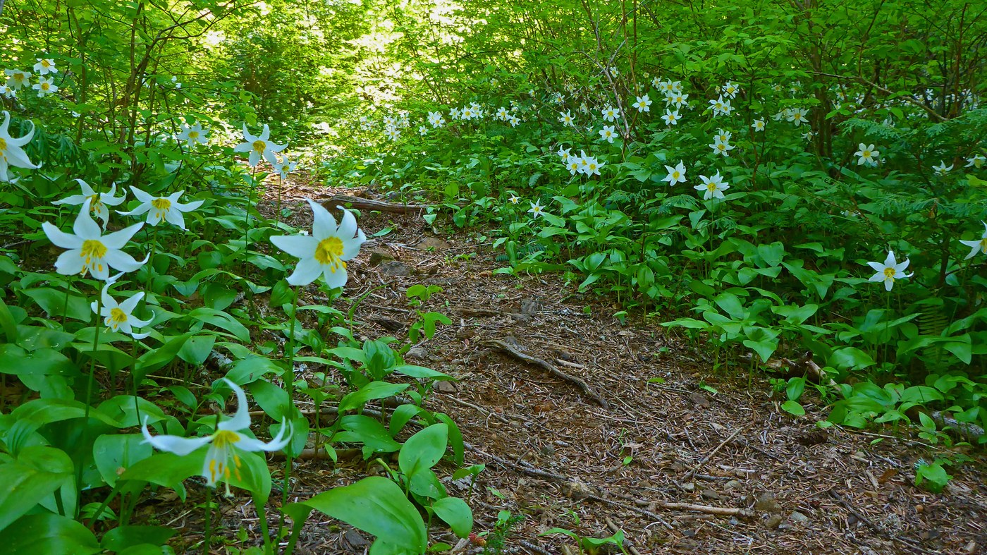 For National Trails Day the Olympia Mountaineers completed a trail work party on Church Creek, our adopted trail, clearing brush and debris, removing downed trees across the trail and doing some minor tread repair. We are happy to report that Church Creek trail is now passable from the eastside trailhead (Skokomish River drainage) to the top of the divide. There is more work to be done on the westside (Wynoochee drainage). We were delighted to find avalanche lilies in profusion along the trail at higher elevations and to have several parties of hikers pass us on this generally little-used trail. The old growth forest along the way is magnificent and the climb offers a great workout with much to enjoy along the way. Only a few small patches of snow linger near the top but are easily crossed.