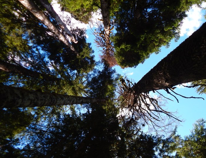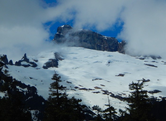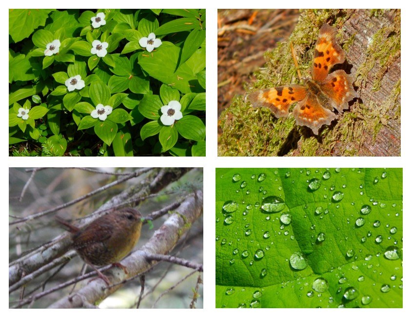The recent rains had the positive effect of reducing the usual dust. Unfortunately all the potholes were filled with water, so the car was coated with mud instead of dust. At the intersection with FS49 a sign was posted reporting Road Damage Ahead. Considering the usual state of the road, this did give me pause. Went ahead anyway and soon came to a spot where a creek had damaged the road. A temporary patch job made it passable and on I went. Just before reaching the trailhead parking lot there was another creek damage/stopgap repair. This one was rougher, but the Honda was able to survive. At 10 am I was only the second vechile in the lot. A pickup with horse trailer made it too. Mosquitoes pretty bad at the parking lot, but not a problem beyond. The hike was wonderful. Only went up two miles. 6 people, 4 dogs, 1 horse and too many Pacific wrens to count.