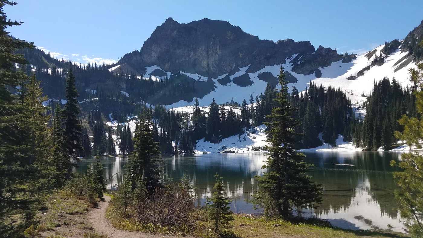Snow should not be a concern through summer if you are thinking about this hike. There is still a bit before the lower lake. But, the maybe 20 foot patch is easily crossed without poles or spikes. Please just kick into the soft snow, rather than walking on the new growth alongside the snow patches. There are a couple more patches of snow on the way to the upper lake, but again no poles or spikes were needed. The two campsites at both lakes are snow-free. You do have to cross a bit more of a snow field to get to the upper toilet. I post holed once getting to it. Good news... The throne is snow free and available for business! Beautiful blue skies greeted me as I arrived. What a nice place. I'm thinking of going back on Friday for Crystal Peak...