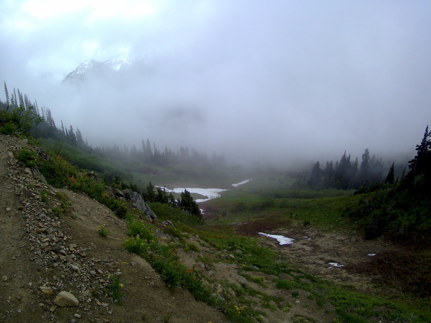 Once you hit the PCT you have a few more snow covered (and undercut by streams) sections to cross. I never felt in danger just quickly made my way across them. Of course I didn't have a 40 pound pack on. These will probably completely melt out in the next week or so. I did not put traction on to cross them as they have well defined steps kicked in.