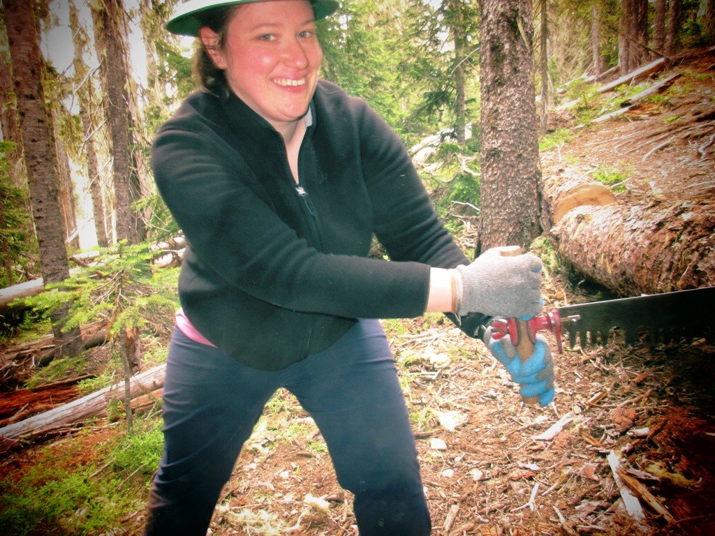As we worked up from the junction, the trail winds through tall old growth timber at a constant moderate elevation gain, from 3800’ to 5,000’ near Swamp Lake. There were many large logs to cut and remove from the trail, many more than expected for our 4-day trip. We hoped to reach the PCT after about 5.5 miles, but time ran out for us and we made it only to about a mile before Swamp Lake, less than ½ way to our destination.