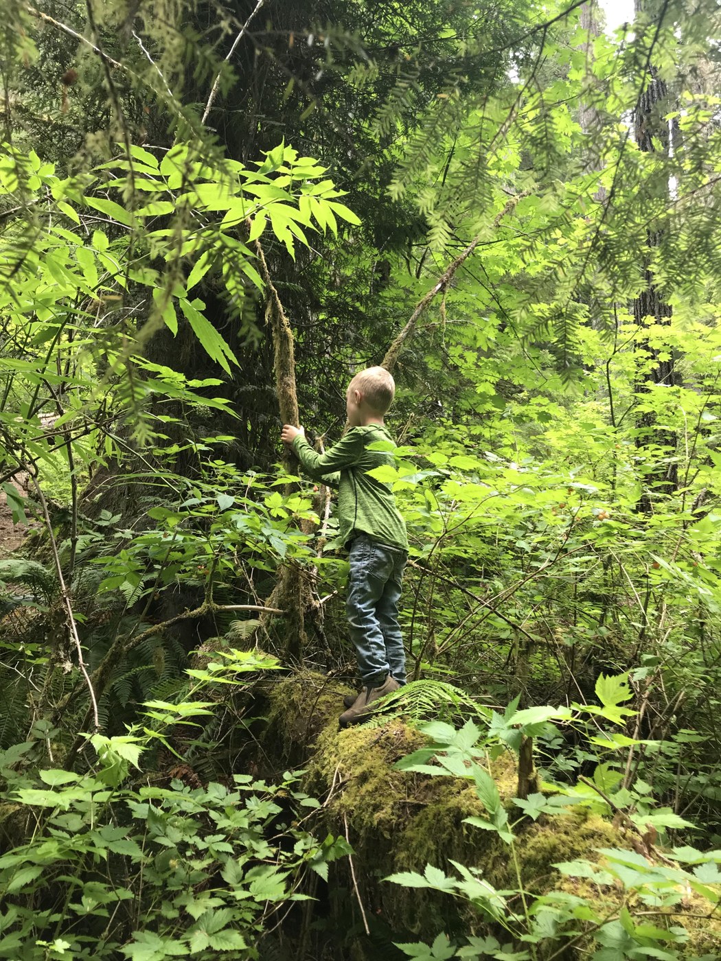 Just after the washout, the old road splits. Head right for the trailhead. (I, uh, might have led our group astray here. We took a short detour, although we found some daisies and blackberries that our kids enjoyed.)