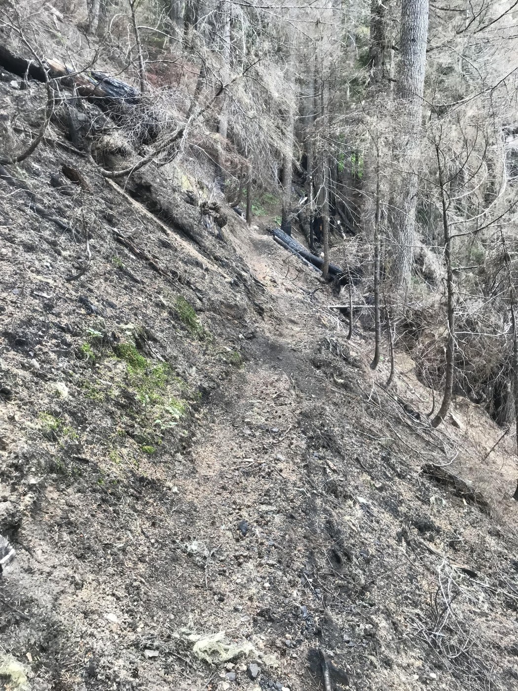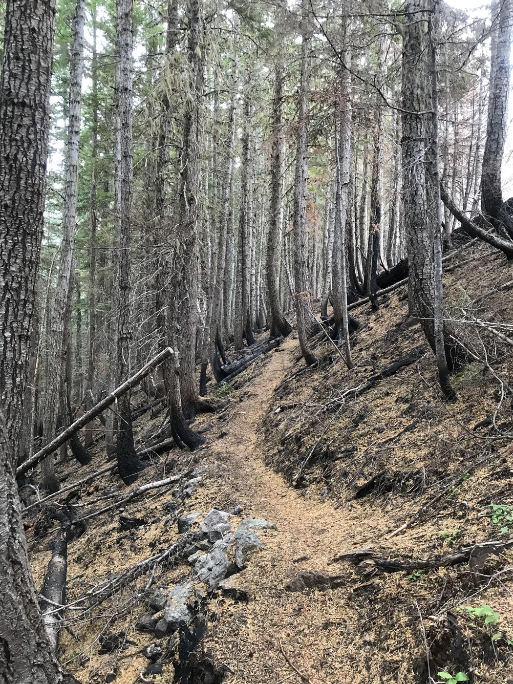 Once you near Little Ranger Peak and the trail turns north, it passes through part of the area affected by the Norse Peak fire last year. The trail becomes quite “lumpy” in this section and you’ll need to be extra aware of your footing. I did not feel unsafe traveling through this area, though it does feel very spooky.