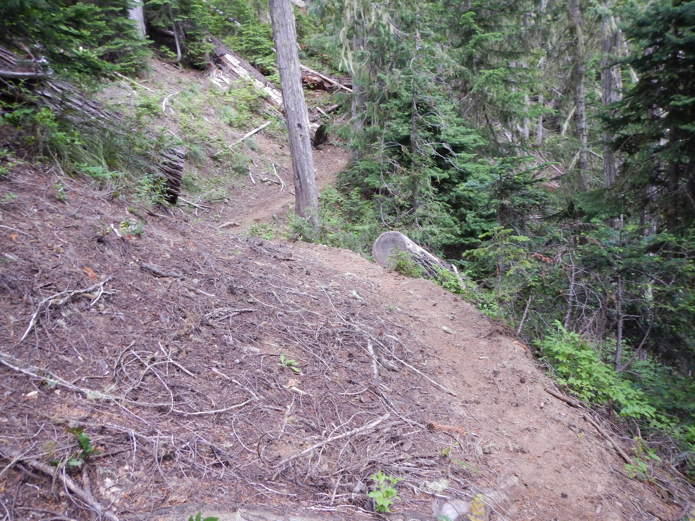 So I headed down North Fork Tieton and boy is it in terrible shape. The last three miles to the pass are in desperate need of rebenching. The slumping is terrible. I could see that a horse group had been up there before me, and I can’t imagine they had fun doing this on a horse. What trail there is really narrow and outsloped, and the trailbed is bad, too—totally uneven. There are also several large blowdowns. A couple of them looked like they’d been stepped over by the horses, but one, about 3.5 miles down the trail from the pass, was laying across the trail, about three feet up off the ground. I have no idea where the horses went around it.