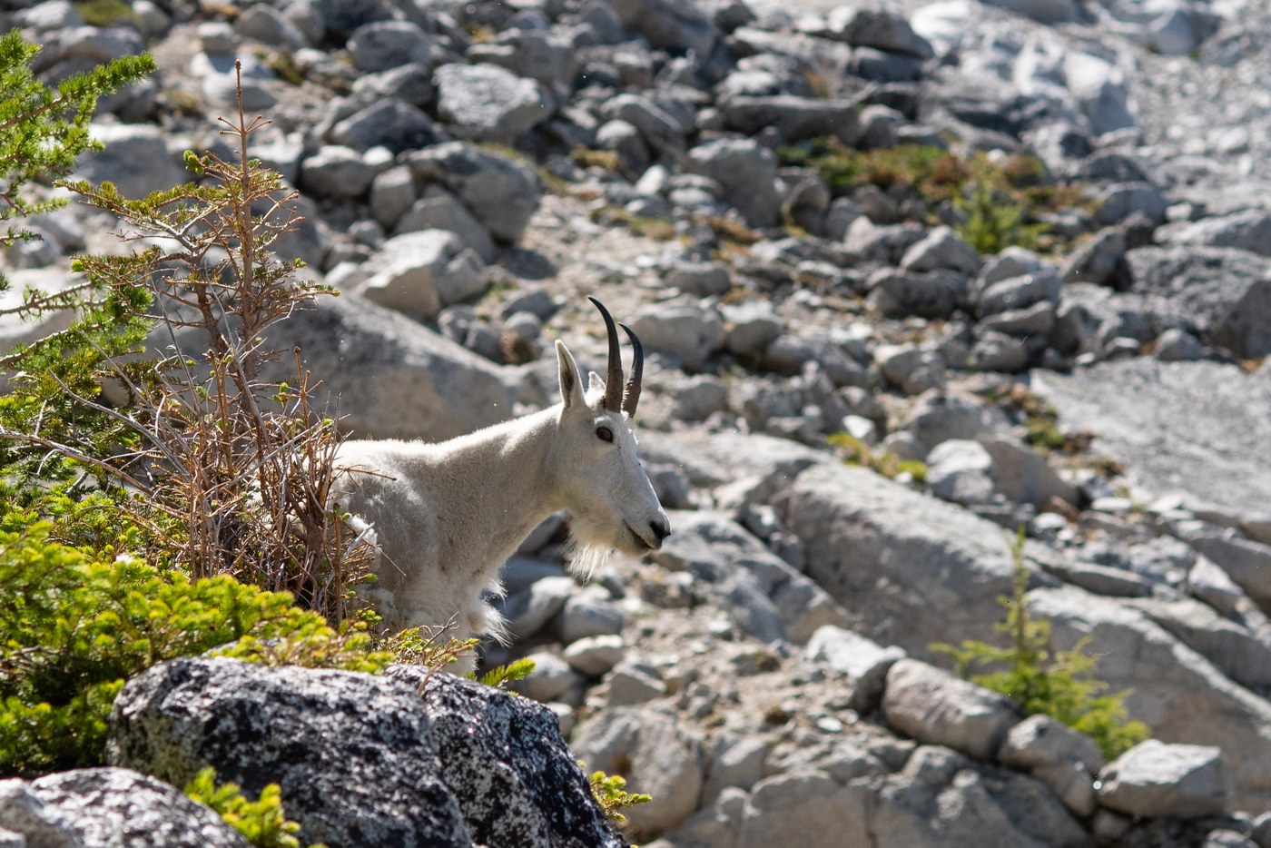 Aside from that, it was a gorgeous day. We saw several mountain goats on the way up and down the pass, along with some pika and our feline friend on the last leg of the trail. The cairn trail up the pass is snow-free. Still snow patches in the upper Enchantments. Another perk of starting earlier: this lot was overflowing at 8am on Saturday. Road is quite bumpy but just about any car can make it if you take it slow.