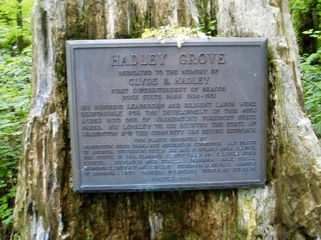 The Hadley Trail climbs gently under the power lines and crests just as it enters the woods. On your left you will see the plaque dedicated to Clyde B. Hadley the first Superintendent of Beacon Rock SP. Shortly you come to the junction for the Little Beacon Rock Trail originally constructed by the CCC and rerouted by the Chinook Trail Association in 2005. This is a very short side trip of .2 miles and with views of the gorge and Beacon Rock at the terminus.