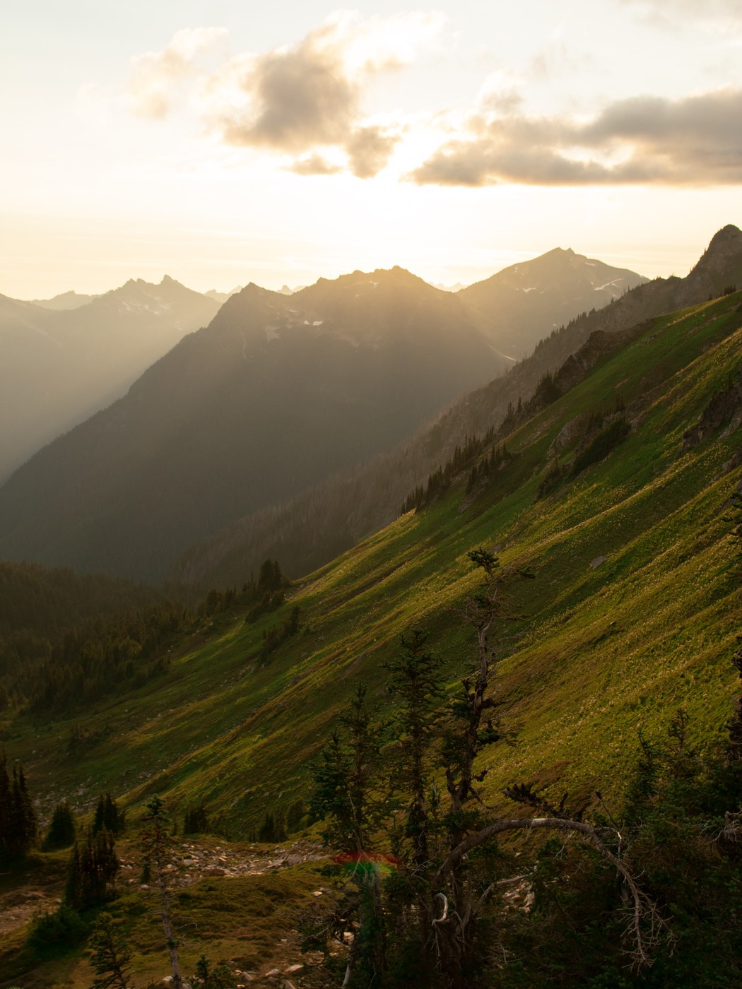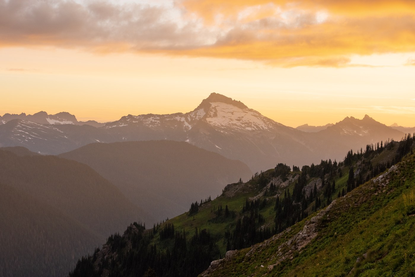 Once at camp, I explored a bit and took a couple side trips while my partner refreshed herself with a nap. I tried to climb White Mountain for an in-your-face view of Glacier Peak, but the boot path was steeper than my tired legs wanted to commit to after the climb up to the PCT, and I turned around 300 feet up or so. Later that evening we hiked the PCT north to Red Pass, where we took in one of the most incredible sunsets we’d seen in awhile. We spread the cremated ashes of our first dog, a spry little black pup named Spacedog, who joined us on our first trip up to this place in 2015. It was a bittersweet moment, sad and beautiful at once.