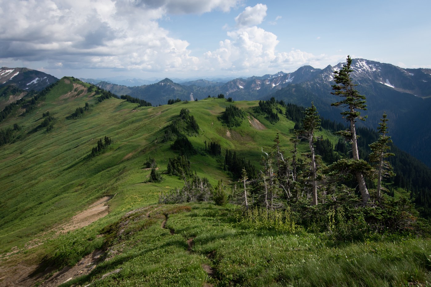 This weekend the weather was great overall, with temperatures in the low seventies and patchy cloud cover giving a reprieve from the high country sun. As evening came on, Glacier Peak helped generate thunderstorms, and we heard rolling thunder to the north all night long. There was no snow on the trail or at White Pass camps, though you could find small patches here and there, especially if you take the time to explore the area...
