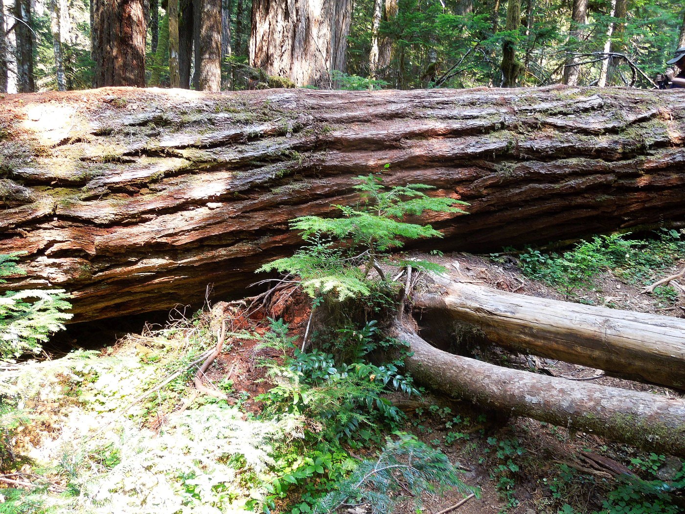 Along the way, we marveled at old growth (OG), giant blowdowns, moss, seedlings, and groundcover. The flora consists of Douglas fir, western hemlock, red cedar, red huckleberry, deer fern, sword fern, and Cascade Oregon-grape. The trail, where we were on it, is in relatively good condition.