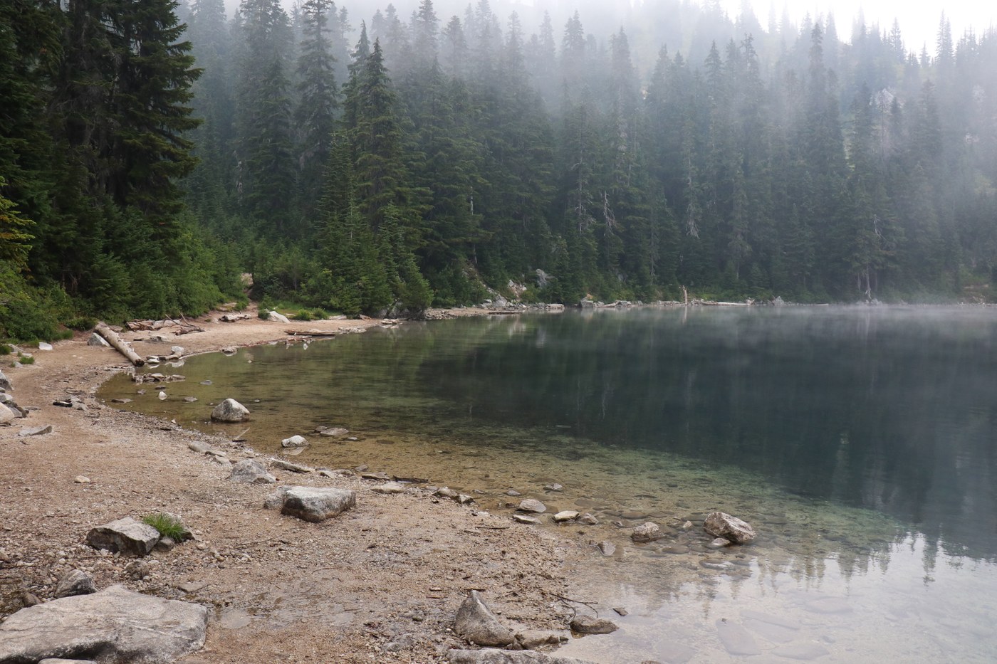 A forecast for minimal rain and minimal smoke led me to the Steven's Pass area. It was an absolutely beautiful, peaceful, and foggy morning hike. I decided to check out the trail that leads up to Mount McCausland even though I knew there wouldn't be any views due to the thick fog and smoke that I'm sure was out there beyond the fog. The turn-off is marked only with a cairn (pictured below) and starts out, and continues, steeply. It felt like I had climbed my way into Autumn! The shrubbery was changing color and there was a very cold fog whipping through the mountain side. I put on all my layers (thermal, insulation, shell, and wool beanie) but it still wasn't enough for the low 40's temperature, so I decided I had seen enough fog and turned back 3/4 of the way up since my summer-adjusted body was feeling chilled. I made my way back down, and headed over to the warmer Lake Valhalla for lunch.