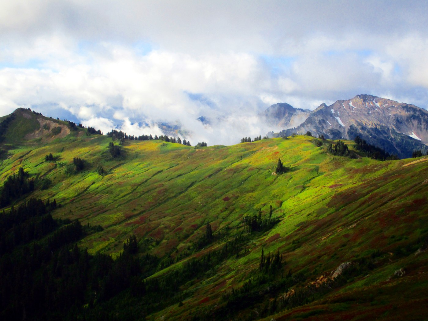 The North Fork Sauk River trail-head was packed when we arrived on Friday night and I was happy we were able to find a parking spot. The trail is in excellent condition and travels through impressive old-growth Doug-fir and Cedar groves for the first mile or two. Many fungi were beginning to fruit. At the collapsed Mackinaw shelter (near mile 6) the trail climbs steeply to the PCT and White Pass where the views really begin. Blue berries were perfectly ripe and we took some well deserved breaks to pick.
