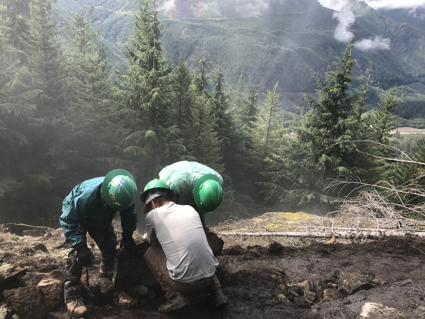The revised Dirty Harry's Peak Trail (marked as DHPT by the new DNR signs) is almost finished. This new portion follows the old Birdhouse Trail, replacing both the Birdhouse Trail, and the old Dirty Harry's Road Trail that started half a mile farther up the road to the WA Fire Training Academy. Today a WTA crew worked on a tough section just below the upper balcony (about 2 miles up). The trail is looking great. It is steep, but mostly smooth, with lots of stone steps and water bars along the way. We started in the fog and misty drizzle, but the clouds cleared around noon. We spent most of the day working a rocky, narrow spot where these photos were taken.