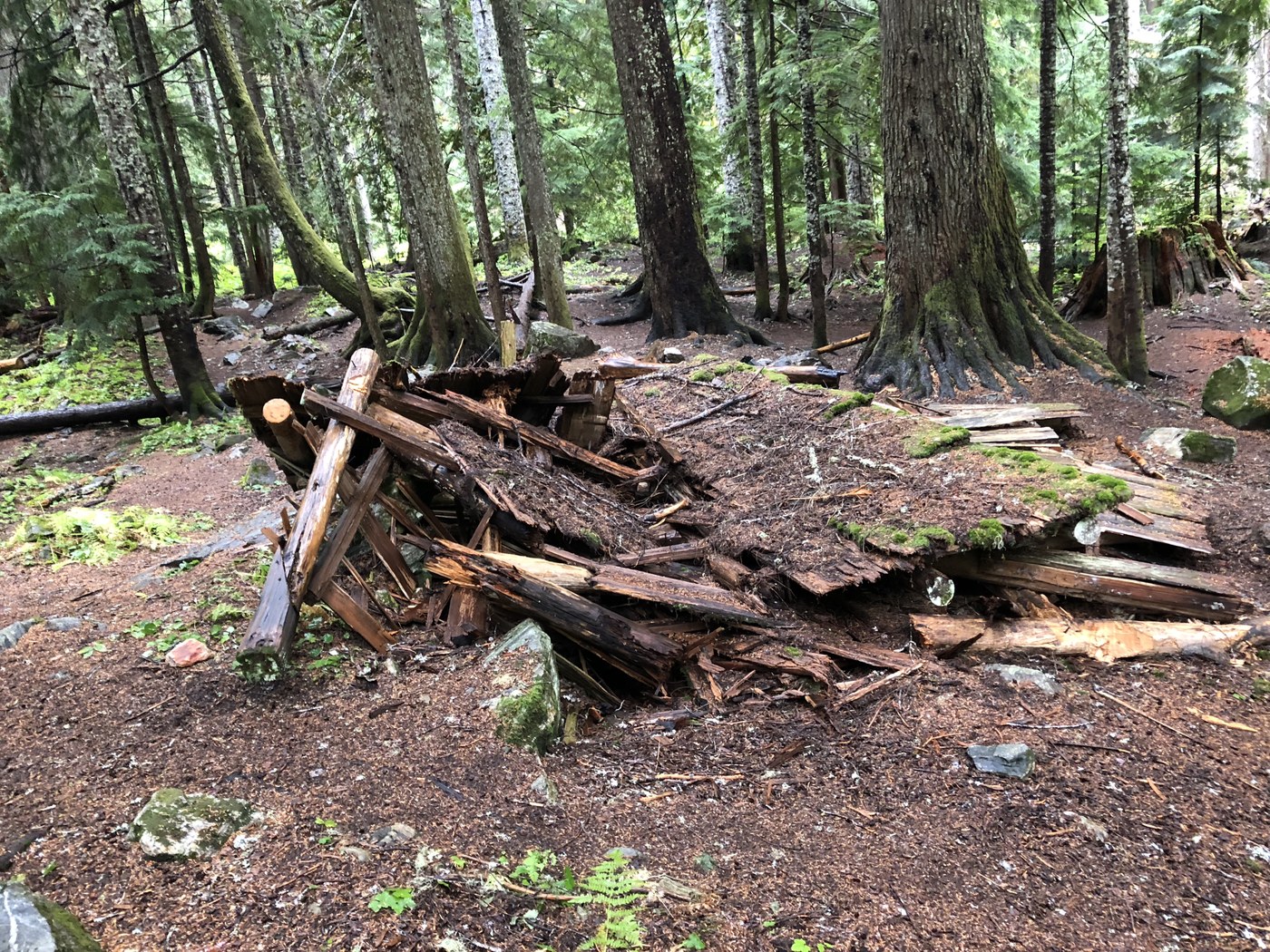 - Raining steady and walking through puddles for flat section until Mackinaw shelter, which seems to have collapsed completely just in the last few days. Last report had pictures of it standing up. Good place to fill up water or make camp before the climb