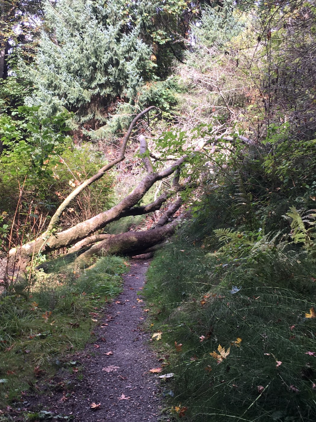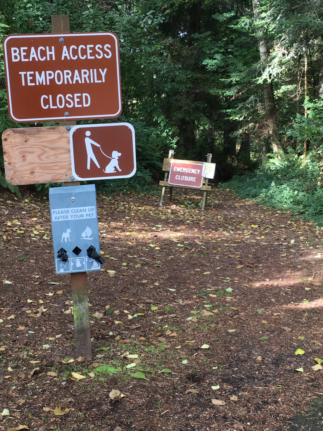 Hiked all of the main trails at South Whidbey State Park today, i.e. Wilbert Trail, Ridge Trail, Forest Discovery Trail, Beach Access Trail. All of the trails are in good condition except the Beach Access Trail. I entered the Beach Access trail from the campgrounds and exited at the parking lot where the Amphitheater is located. At the Amphitheater entrance there were 2 big signs saying the Beach Access Trail is closed, but there are no signs stating this elsewhere. In hiking down to the beach it is easy to understand why the trail is closed. The trail is passable if the trail is dry, but there is a near wash-out section that would be hazardous if the trail was wet, and there are multiple trees down on the trail that you have to climb over, under and in one case through. Finally, the stairs at the final end of the trail have been destroyed by soil movement. You can get to the beach, but it takes some effort.