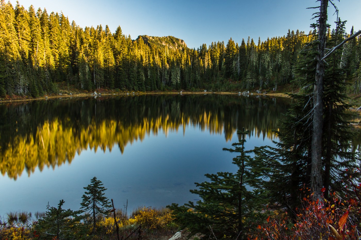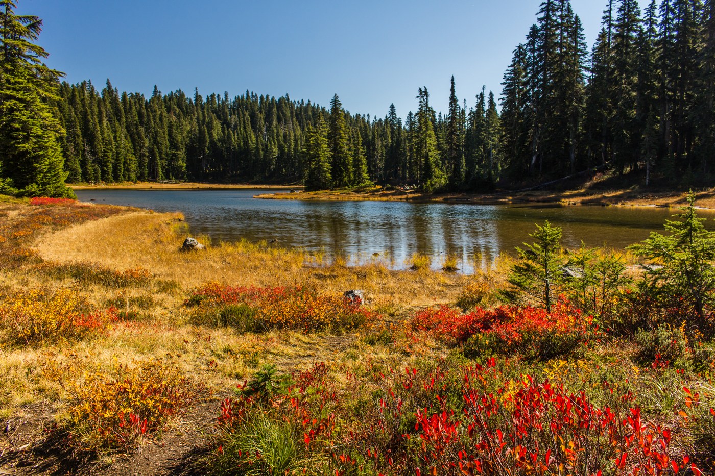 Fall colors at Clear Lake on the Indian Heaven Trail; and at Cultus Lake and Deep Lake, are also past their prime. The fall colors around Cultus Lake, however, are very pretty, still, and you can still get some beautiful photos there around the meadows leading up to the lake.