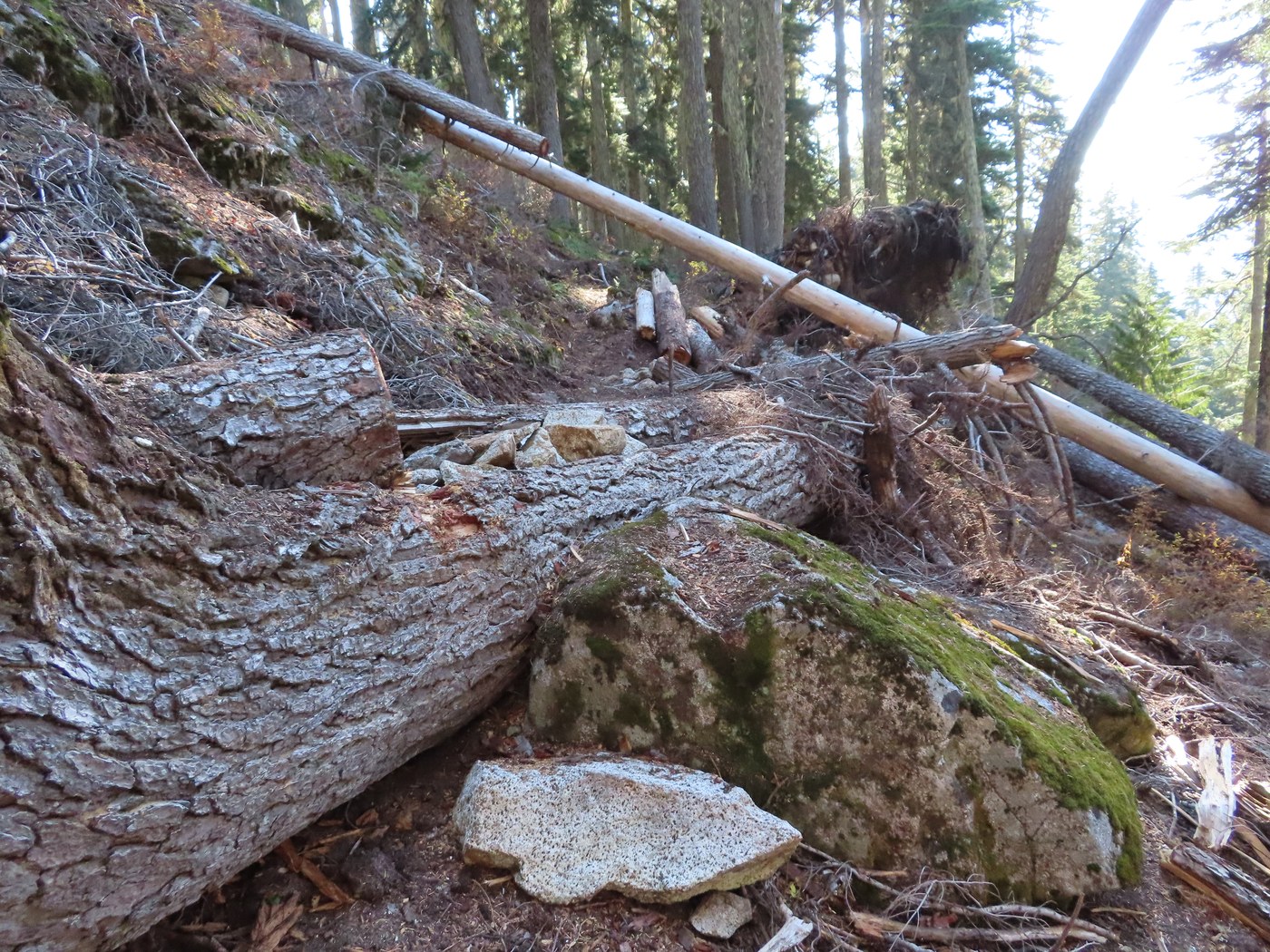 Thanks for the report. I recognise the first two blowdown pictures from our hike there a year ago. Thats about where we turned around after hiking all the way from the Martin Creek TH. My short legs were not in the mood. We could not see where the original trail came in then. Interesting that the 'new' trail is actually an old trail revamped. If that trail gets all logged out it will be a nice alterate trail to Johnson Ridge. Hang on to that collection of old maps, what a hikers gold mine!!