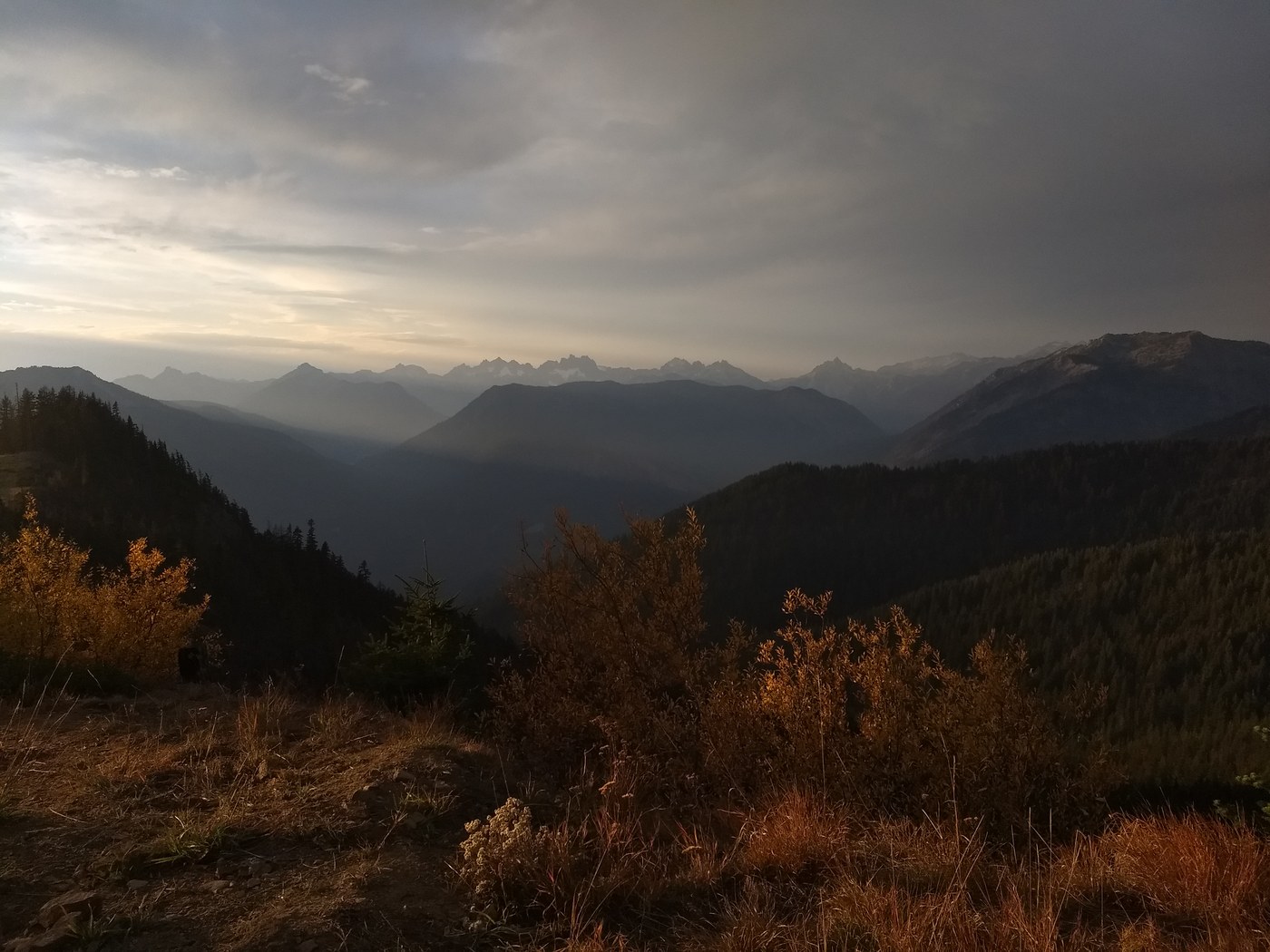 I made up my detour pretty well, and at 4 15 (my original turnaround time) I was halfway up the final switchbacks to the summit. There still seemed to be plenty of sun. I did a timetelling trick that Scott taught me and determined I actually had until 6 45p until complete darkness (earlier research had said last light was at 6pm). I knew I could move fast downhill, so the return would be quicker, so I went for it. There was a teeny bit of snow on the ground here. It must have really come down in September, because the trail was still a little muddy from recently melted slush. Nothing you need microspikes for, but if the rain returns bring traction or at least good boots.