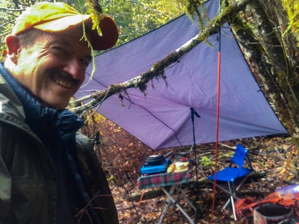 There was a narrow rain-free window forecasted from dawn to 10am so I left quite early. I saw no one else on the way in. After about 2 mile I found the perfect spot and set up the table, chair, stove, tarp and even table cloth. The menu this year was: turkey & dressing inside a lasagna noodle roll, turkey & dressing inside a puff pastry roll, a pear stuffed hassle back yam, a cranberry sauce filled blood orange, 3 escargot bourguinon, a French cheese tray and chocolate truffles. What a delightful setting for a terrific feast! I left no trace of course.