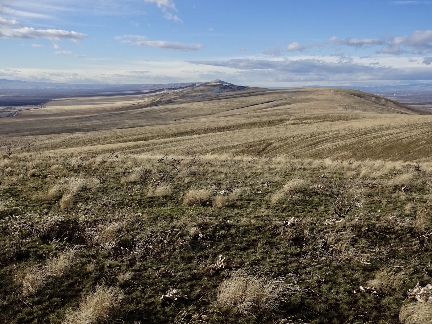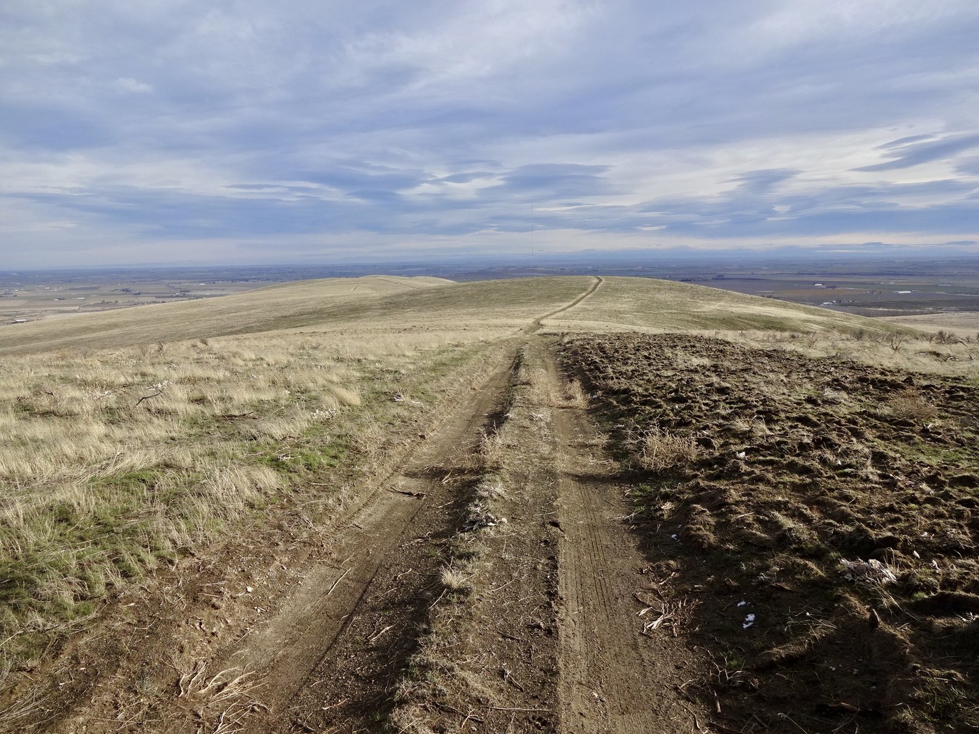 I hiked the ridge from the lookout point at the end of the access road leading to the ridge top of Saddle Mountains where the old Nike Missile control site is located at 1975.' This is mainly a cross country route with some hiking on dirt roads. A short and steep trail drops 130' to the Corfu Gap before rising again to a 2070' high point with fabulous views of the area. The trail does not continue beyond here but the undulating ridge is broad and open and again drops to Saddle Gap at 1570' where waters from the Missoula Floods rushed through during the last ice age.