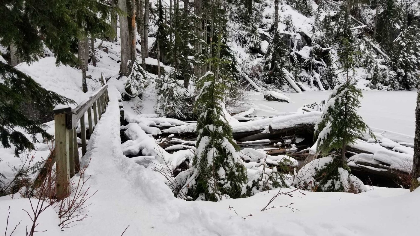 Trail bare of snow but very wet/muddy at low elevations. Don't wear white Keds, Converse All-Stars, blue jeans, your nice dinner coat, etc, if you want to safe. Ice and slush as you approach the lake. Very slippery in some spots (lots of opportunities to get hurt). Microspikes were very helpful. A couple of blowdowns, one particularly gnarly one that you must climb under/through. Watch your head. Lots of snow at the lake. Lake itself frozen over. Great view as always. We cooked up some ramen and enjoyed having the lake mostly to ourselves. Very few people on the trail on this Wed, though as always we encountered some people with seemingly no gear and at least one party that asked, "is this the trail to the lake?". Seriously don't hike if you don't want to take time to prepare. Otherwise stay safe and have fun!