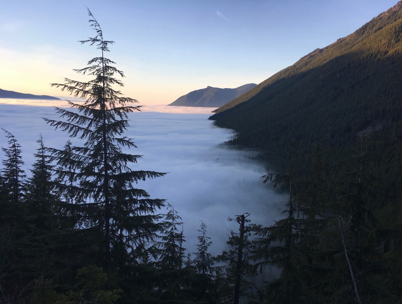 Absolutely unreal day for this hike! It was our first time. Had a friend visiting, and we were hoping to give her a taste of the WA outdoors. This hike was a winner from the start. The weather forecast said it was going to be sunny today, especially toward late afternoon, so that's when we planned the hike. Got there around 2 or 2:30 and the entire drive from Seattle was blanketed in dense clouds of fog. I was beginning to be skeptical that we would get to see much, but in the back of my mind, I was thinking there was a chance we'd be able to hike just above the cloud cover and get some fantastic views. We lucked out and that's exactly what happened. Started through dense fog which made the vibrant green colors of the forest pop even brighter. Around a mile up, we started seeing faint signs of blue sky and sunlight. The sun was pouring through the fog and trees and creating a beautiful display. Hiking just a bit more up, we found clear skies and a blanket of clouds beneath us.