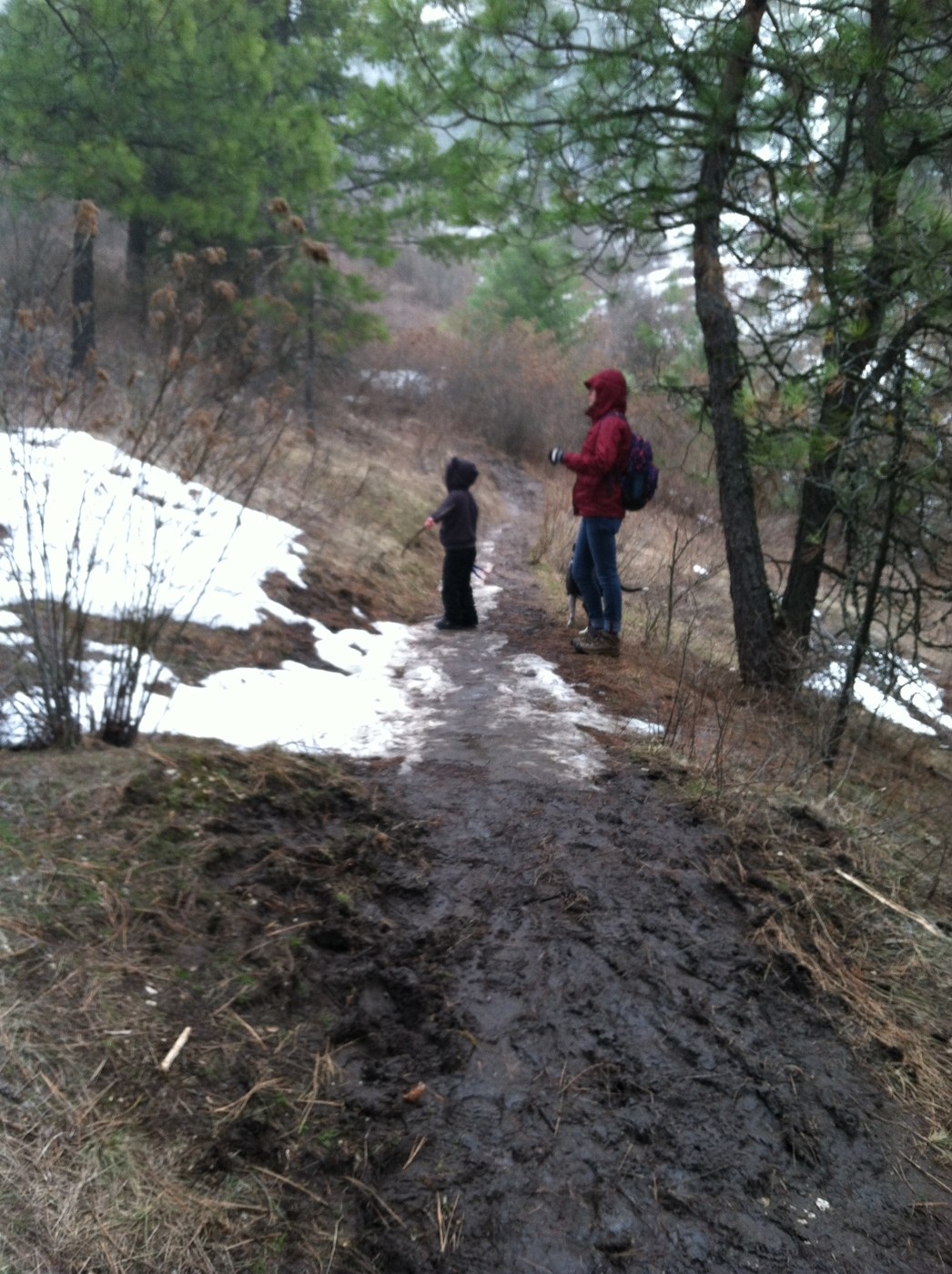 Going in at 11:00 the trail was a mix of frozen ground (easy), packed snow (not too bad), packed ice (all three of us maneuvered with care), mud (not TOO bad). A few spots I wished I’d brought my micro spikes but did OK. We turned around at what I call the “Little Rock” about 3/4 to the top due to a tired 4 year old.