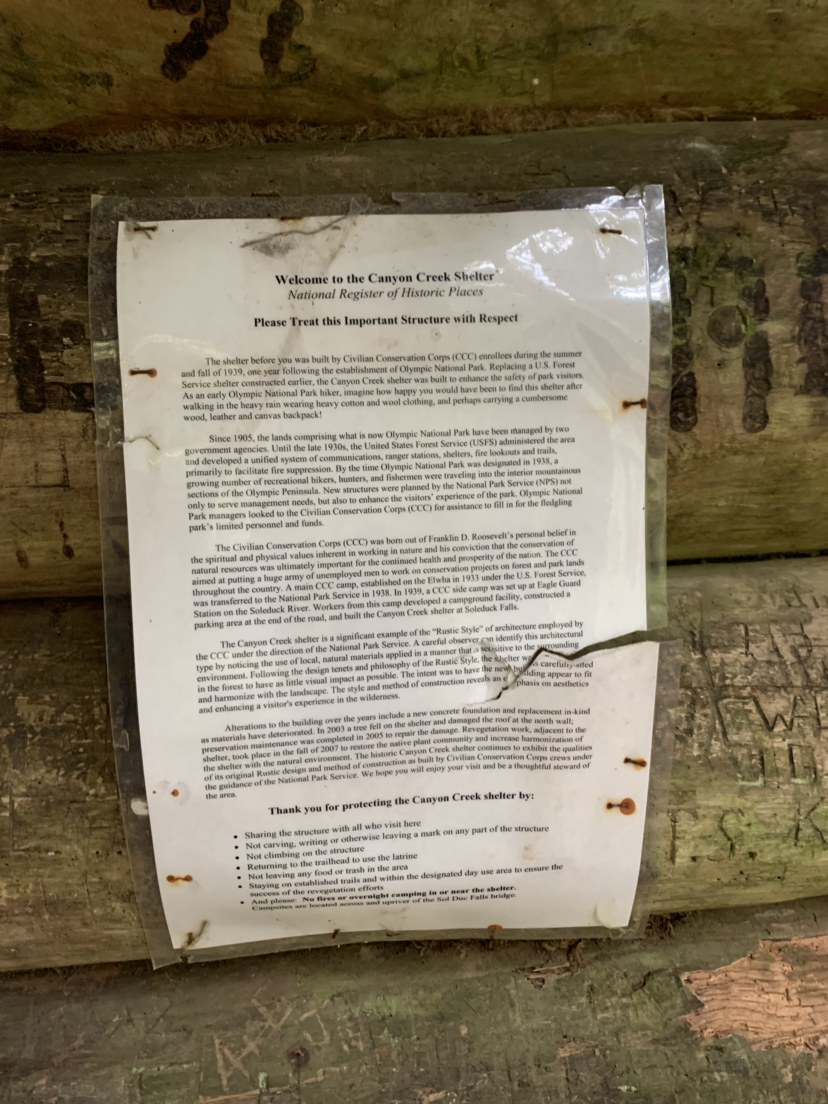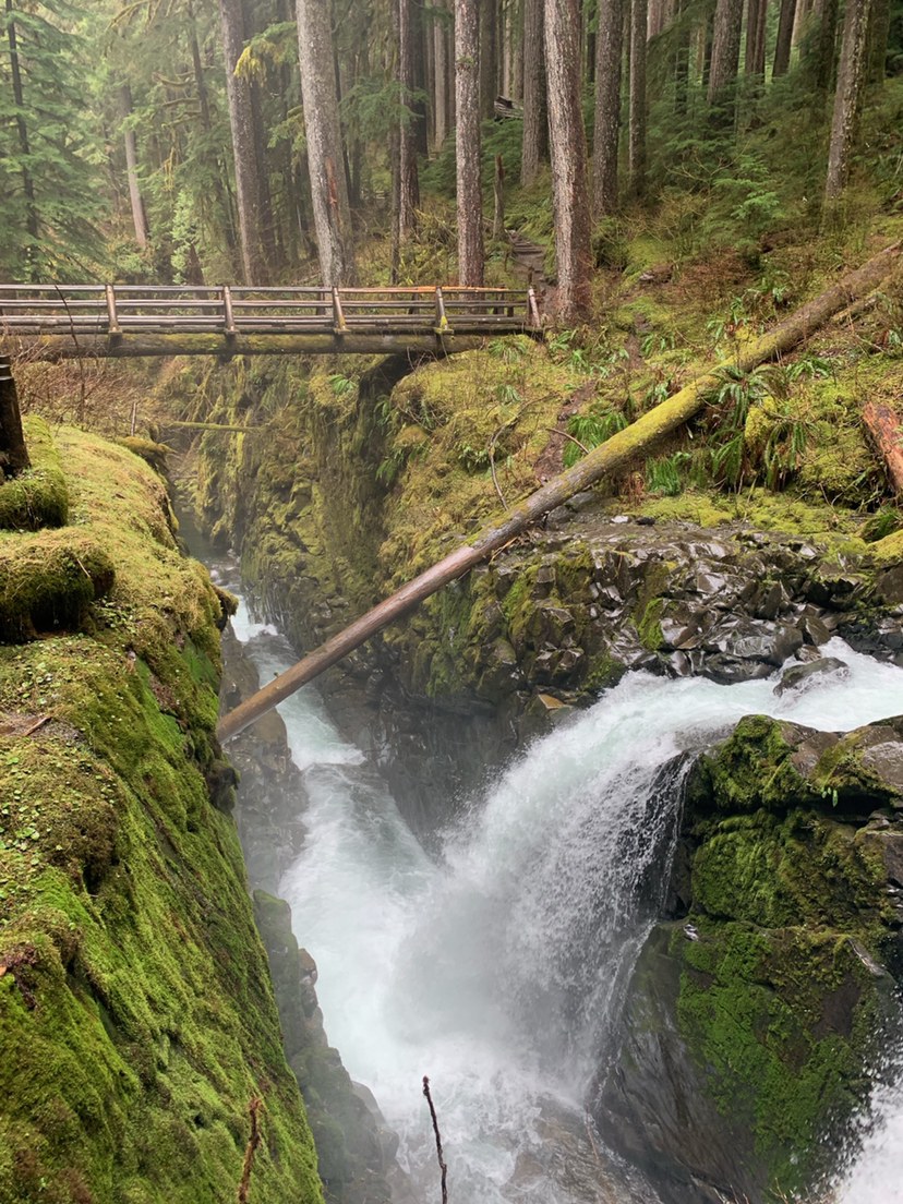 Beautiful. Amazing. Full throated roar of a fall. We spent a few days on the coast day hiking and at the recommendation of the Kalaloch Lodge we decided to go to Sol Duc (sole duck?) Falls on our return drive. Wow, it is a remarkably beautiful short hike through moss carpeted forest, you cross a boulder strewn river on a small bridge, and it is like a dreamscape, lush, verdant almost so perfect that it feels designed rather than real. Continuing along on this short hike (with lots of potential for longer routes) it’s only a hop, skip and a jump to the falls but you will have to hop, skip or jump because there are two blow downs across the trail. They are already roughed up by the many feet that have crossed them so you shouldn’t have any problems. On the left, set back from the trail is a shelter, built originally by the CCC, (thank you new deal!), in 1939. Almost immediately ahead you can hear and then see the falls themselves, and they are awesome, a fast, full river that plunges thru three gaps into a narrow deep canyon. There is a bridge and various viewing spots but I cannot adequately convey its power. Go!