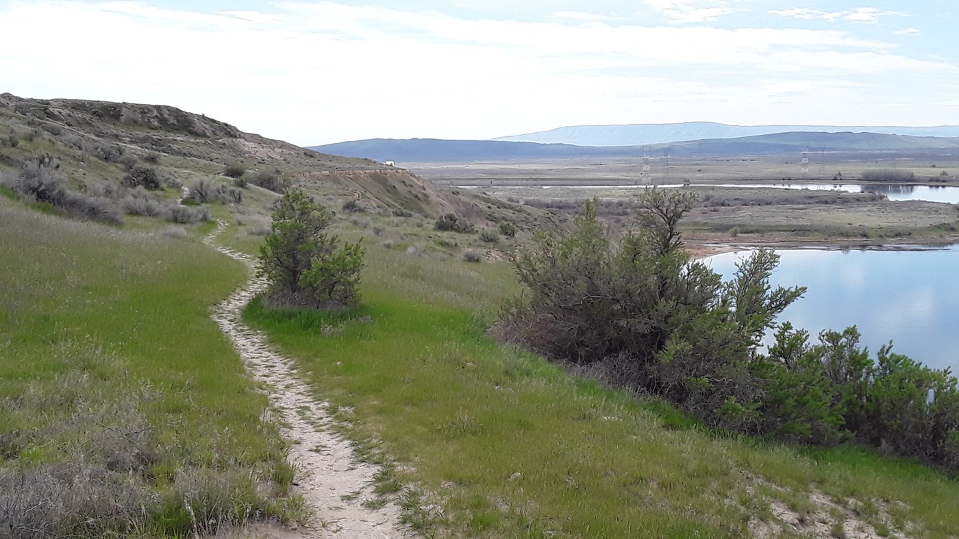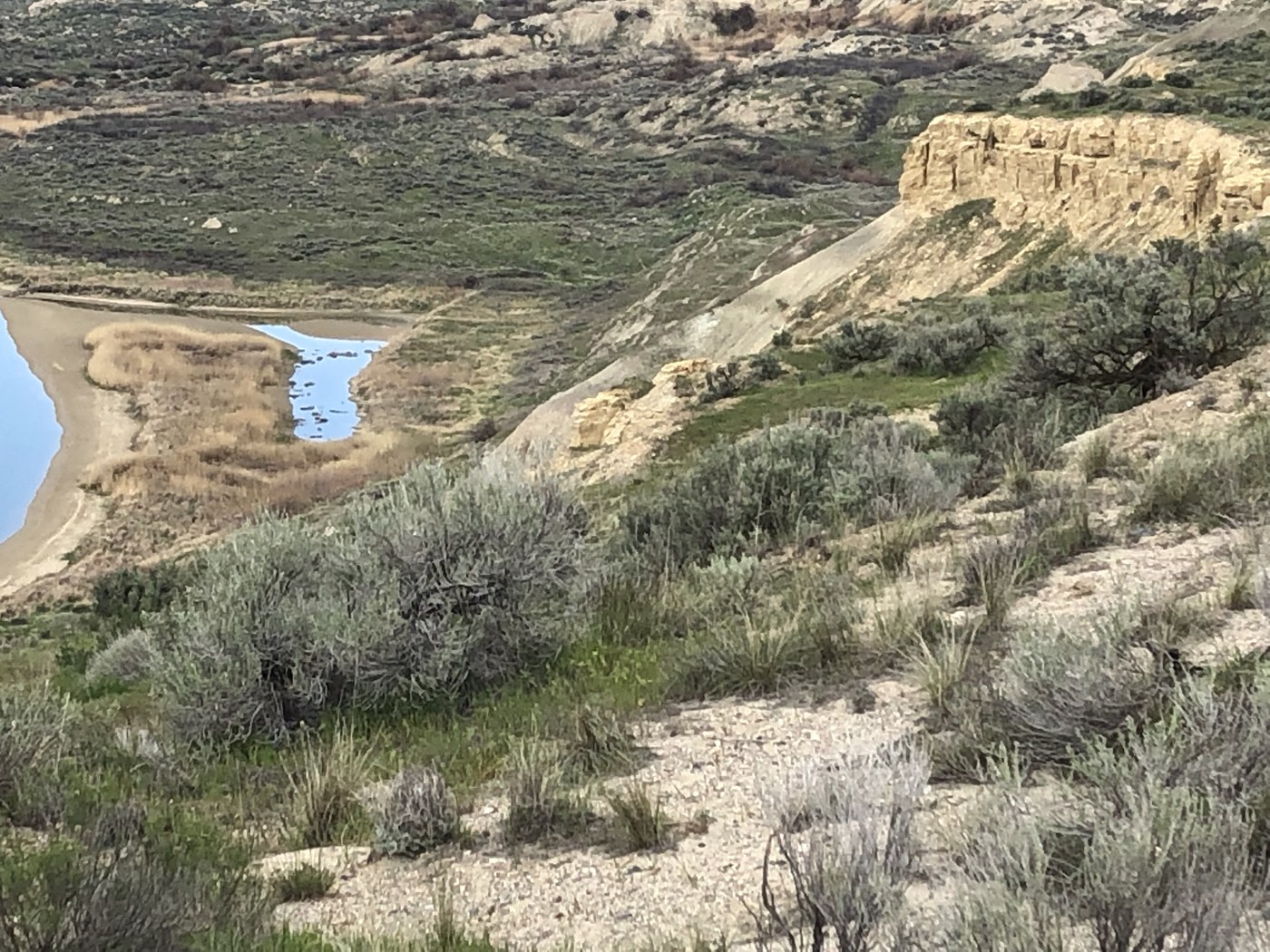 I hiked 1.7 miles of the trail mid-day and turned back because I had to catch a flight home to Seattle. I wish I had kept going because the Columbia River and her riparian habitats were magnificent in the spring sunshine. This hike immediately gains several hundred feet of elevation to get to the top of white bluffs and from there meanders through shrub-steppe habitat, including parts of the trails that go across sandy soils. The stingy insects were out in force and the trail passed one hornet hive in a sage bush right by the trail (about half a mile in). It was a sunny day and hot for this time of year, but the views made the effort worth it.