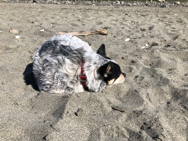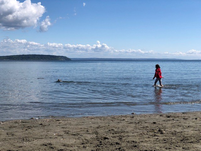 The whole family headed out for a trip to Whidbey Island. It was a lovely, sunny day and Double Bluff was as lovely as always. We arrived around 1:30 and found a parking spot in the main lot, although it was the last spot and cars were parked along the road leading away. The drinking fountain near the restrooms is turned on, but the dog water/dog washing fountain near the doggy entrance to the beach is not yet turned on.