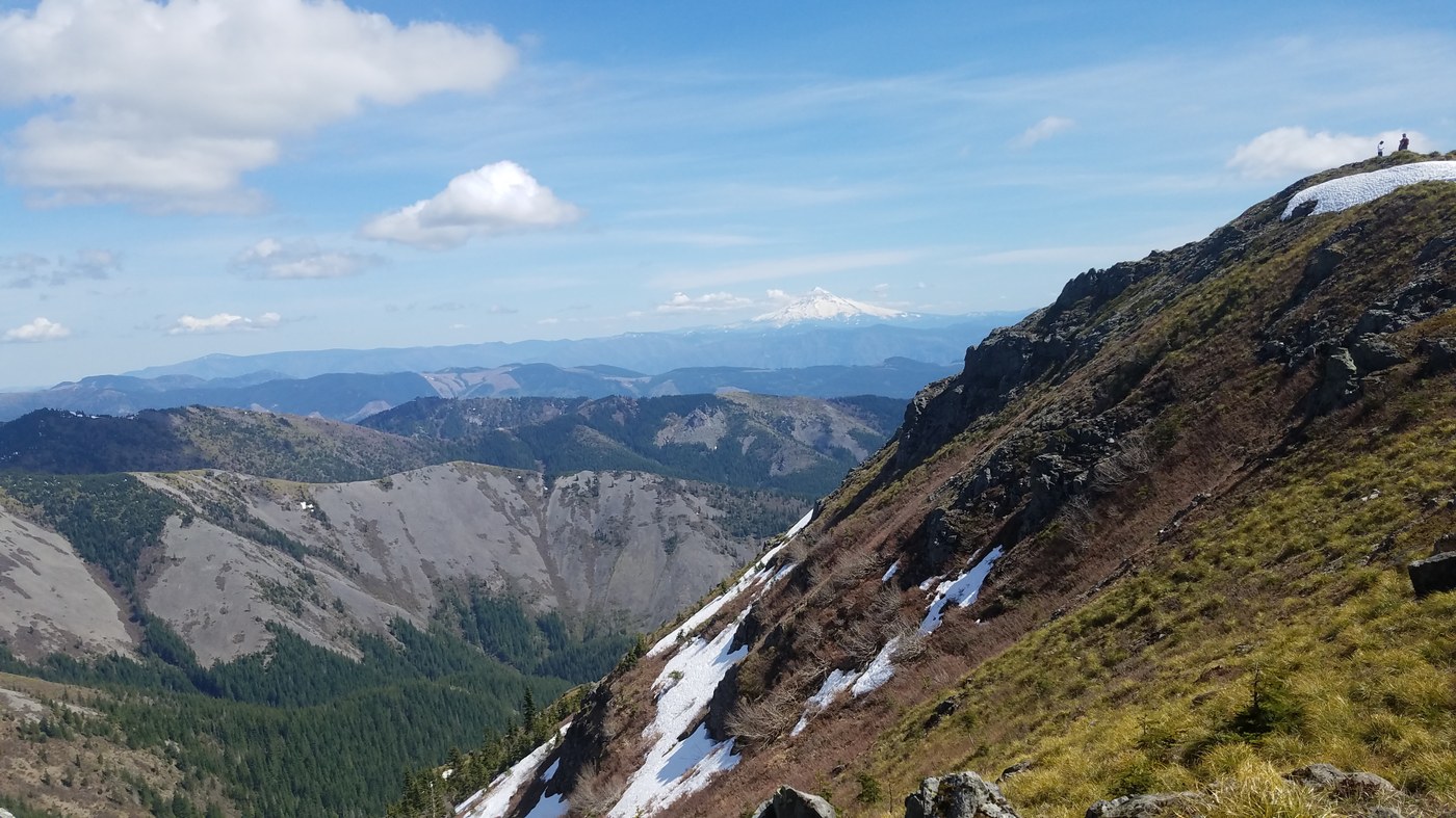 Views were absolutely spectacular from the summit. We could see at least seven volcanoes, although the WA ones were rather moody, with clouds obscuring the peaks. Mt. Hood was putting on a show!